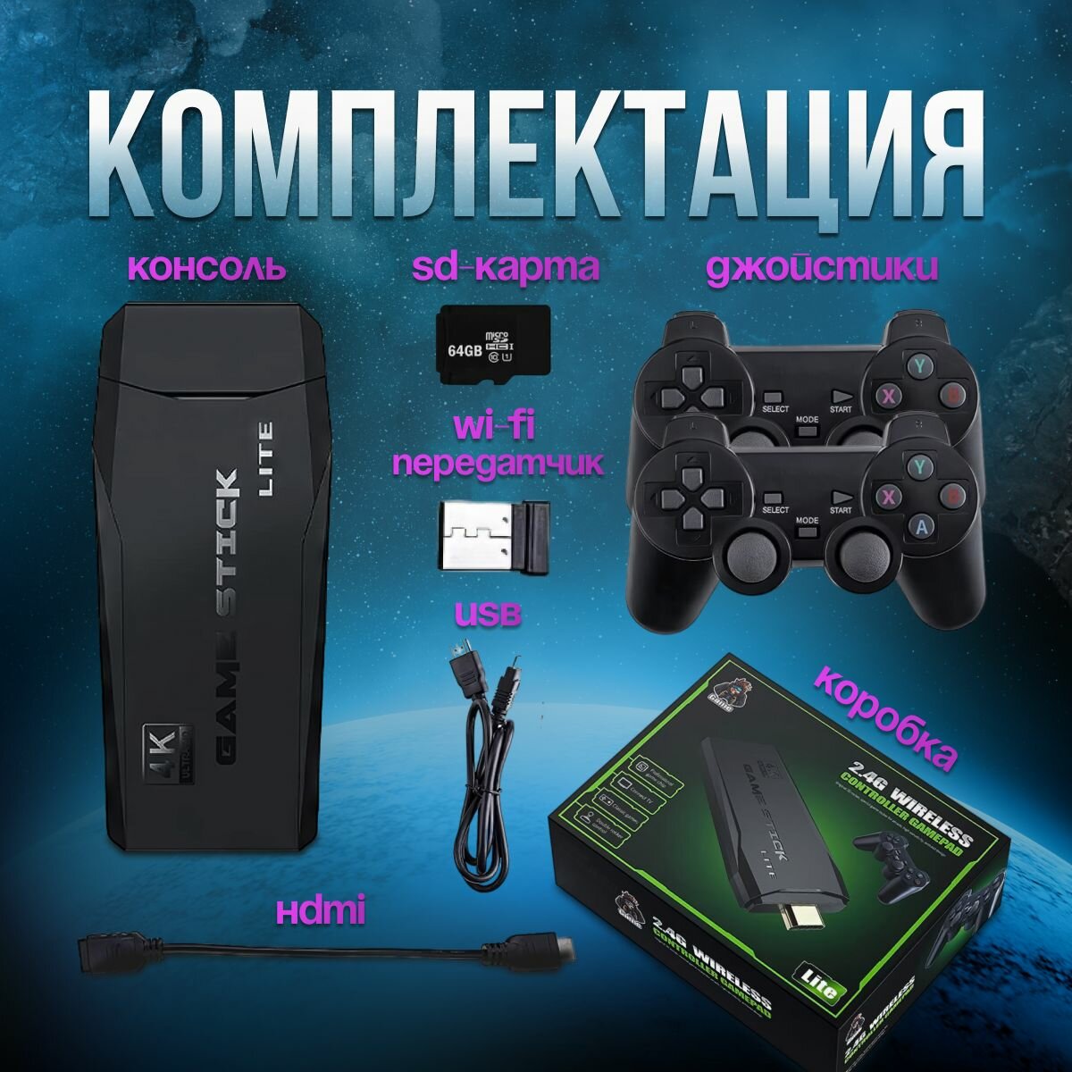 | Подробная комплектация | Стик Lite 64G, два беспроводных джойстика, 2 кабеля, инструкция (английский) |