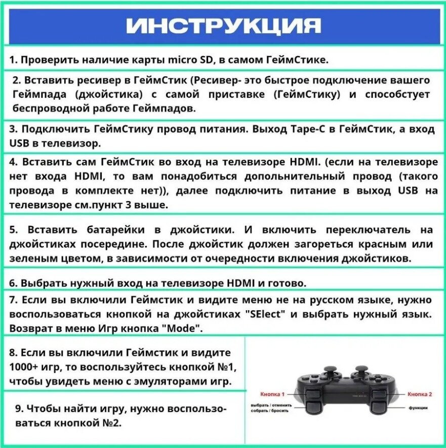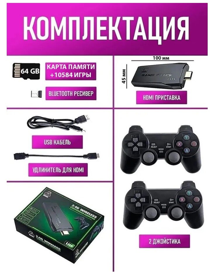 | Дополнительная информация | гейм стик-1шт джойстики -2шт карта памяти 64гиг-1шт кабель питания-1шт удлинитель HDMI-1шт упаковка инструкция USB ресивер для джойстиков -1шт |
