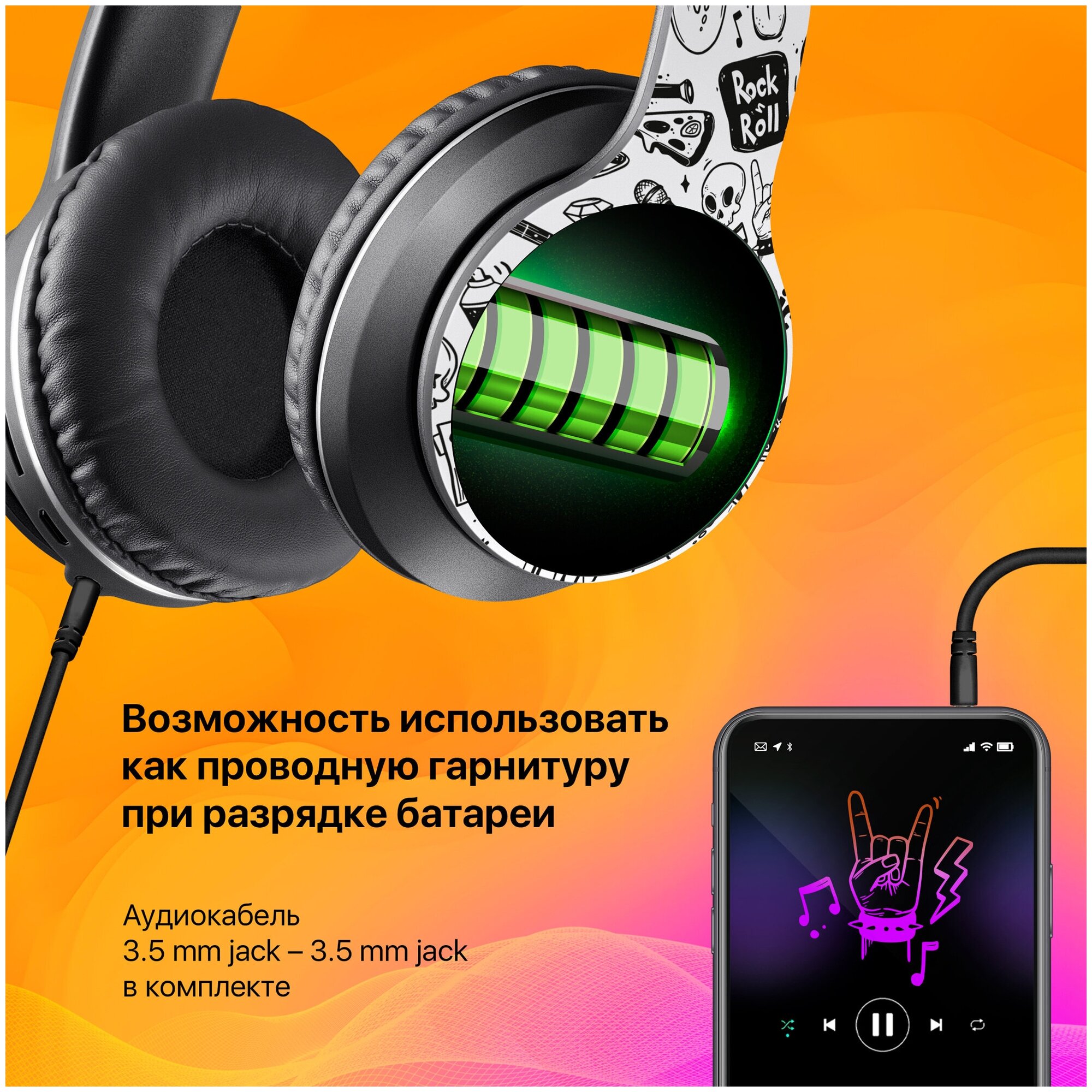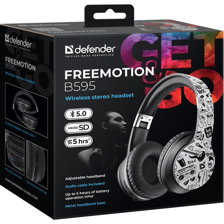 Наушники беспроводные накладные большие гарнитура Defender FreeMotion 595, Bluetooth 5.0 + microSD + MP3 плеер + AUX кабель, черный + модный принт