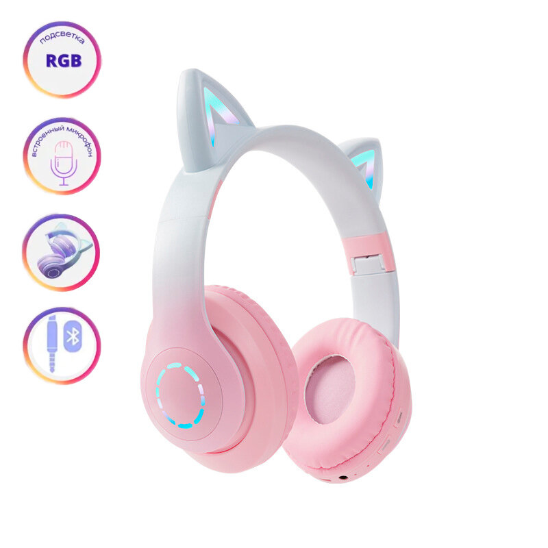 Светящиеся наушники с кошачьими ушками, беспроводные детские, Розовый/Голубой