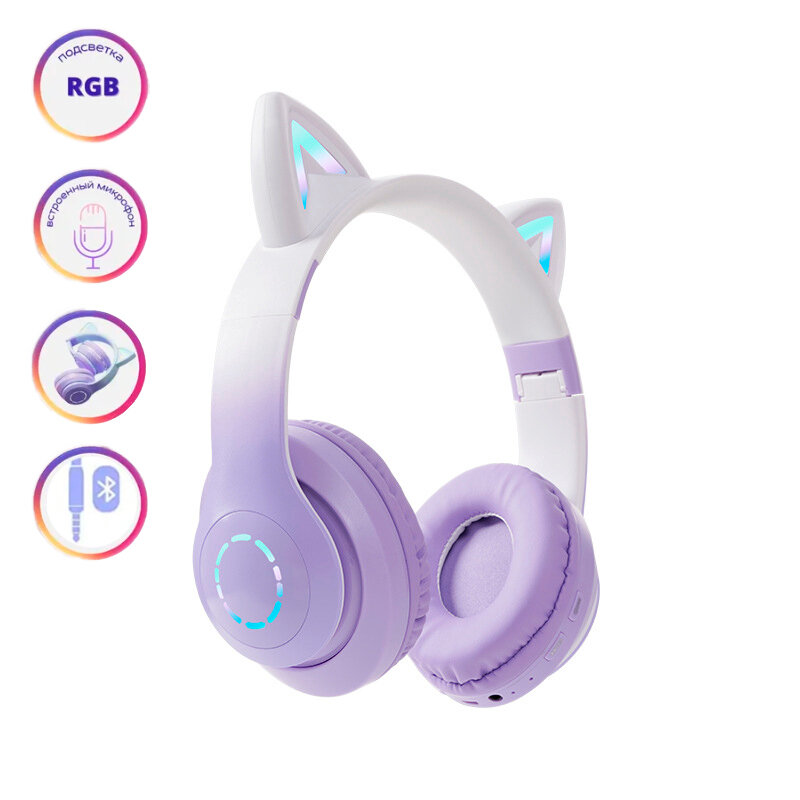 Светящиеся наушники с кошачьими ушками, беспроводные детские, Белый/Сиреневый интересное: