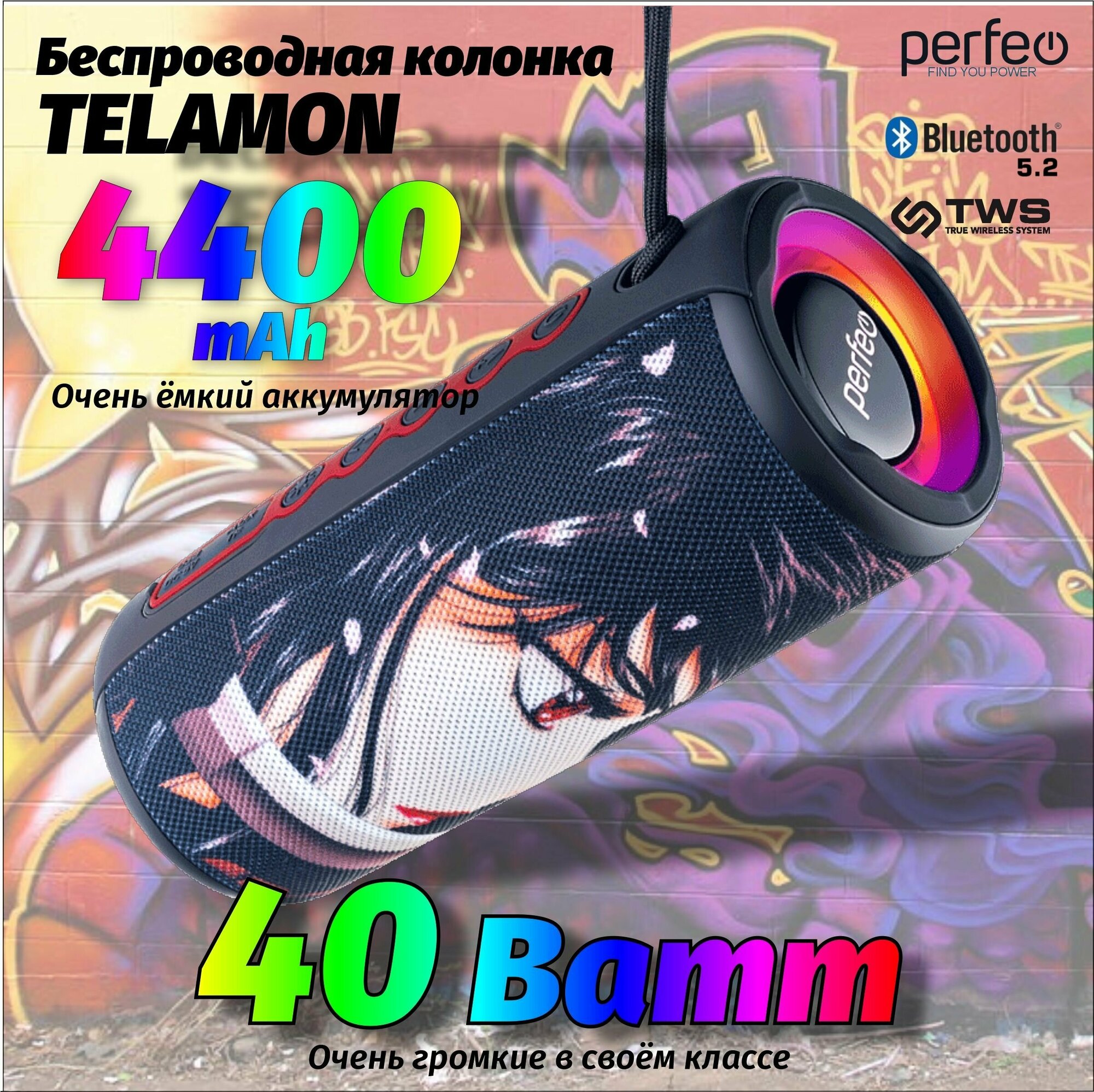 Портативная колонка Perfeo Telamon "Манга" (40 Вт, Bluetooth, microSD, aux 3.5mm, USB, FM, подсветка, микрофон)