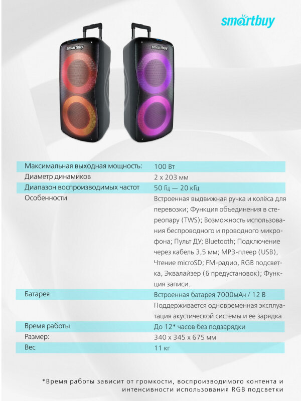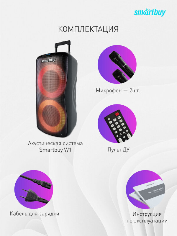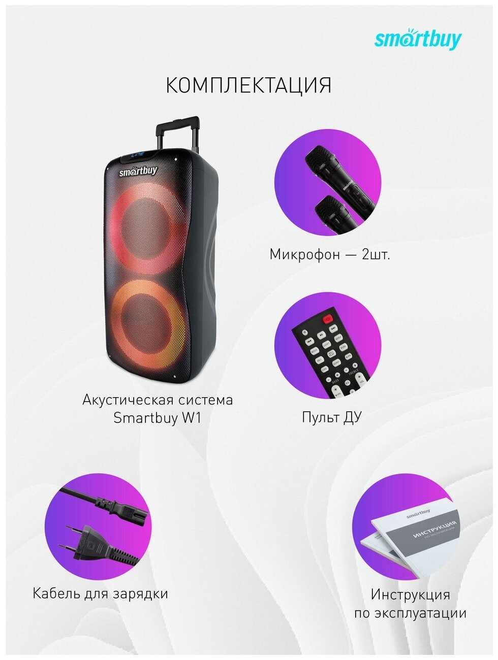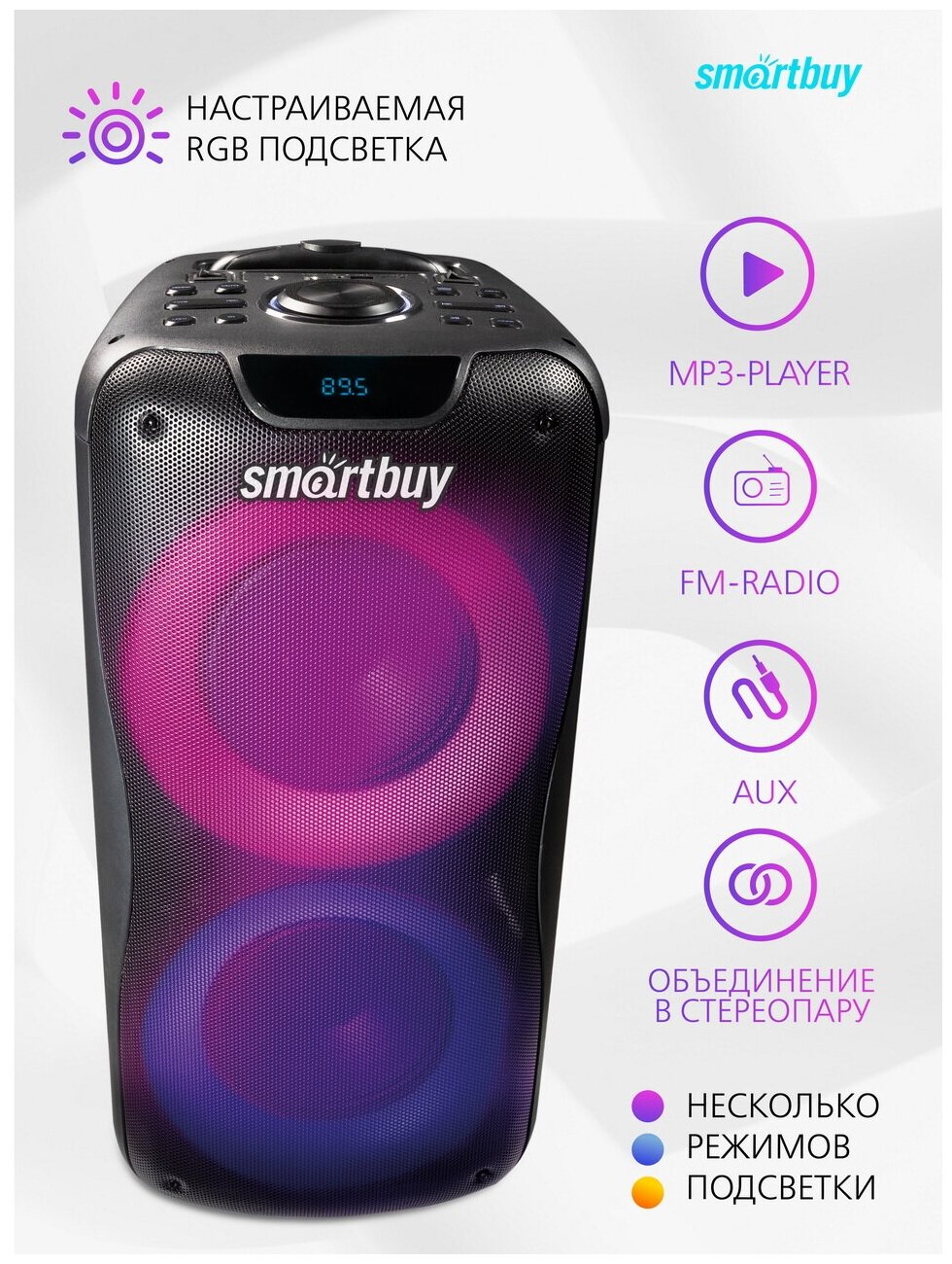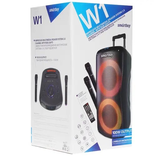 Колонка портативная Bluetooth SmartBuy W1 100Вт, EQ, MP3,FM, RGB, 2 БП микрофона (SBS-5210) интересное: