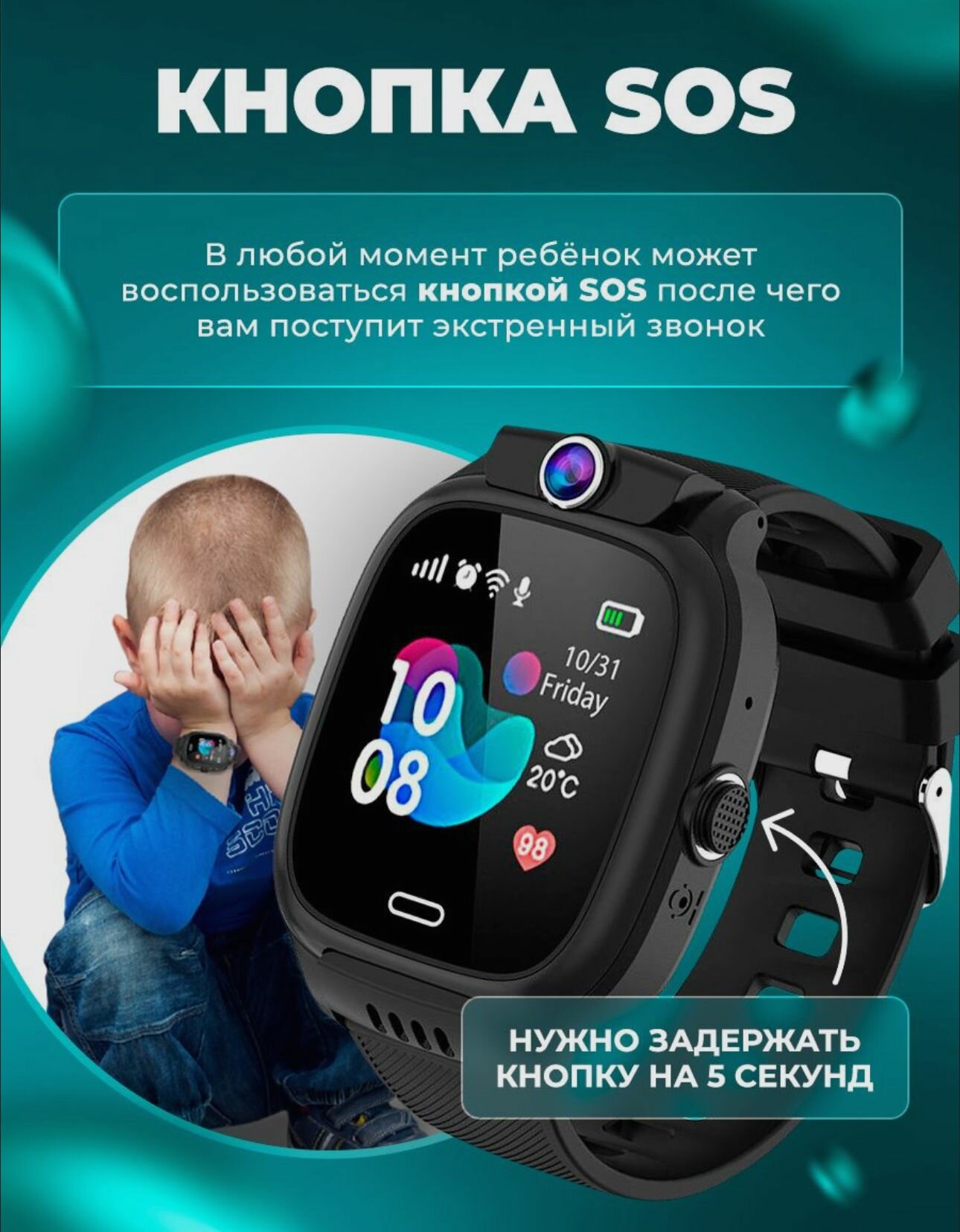 Черный Детский Смарт часы Y31 с GPS и SIM картой, Wifi, камерой, кнопкой SOS, будильником и телефоном / Smart Watch Y31 интересное: