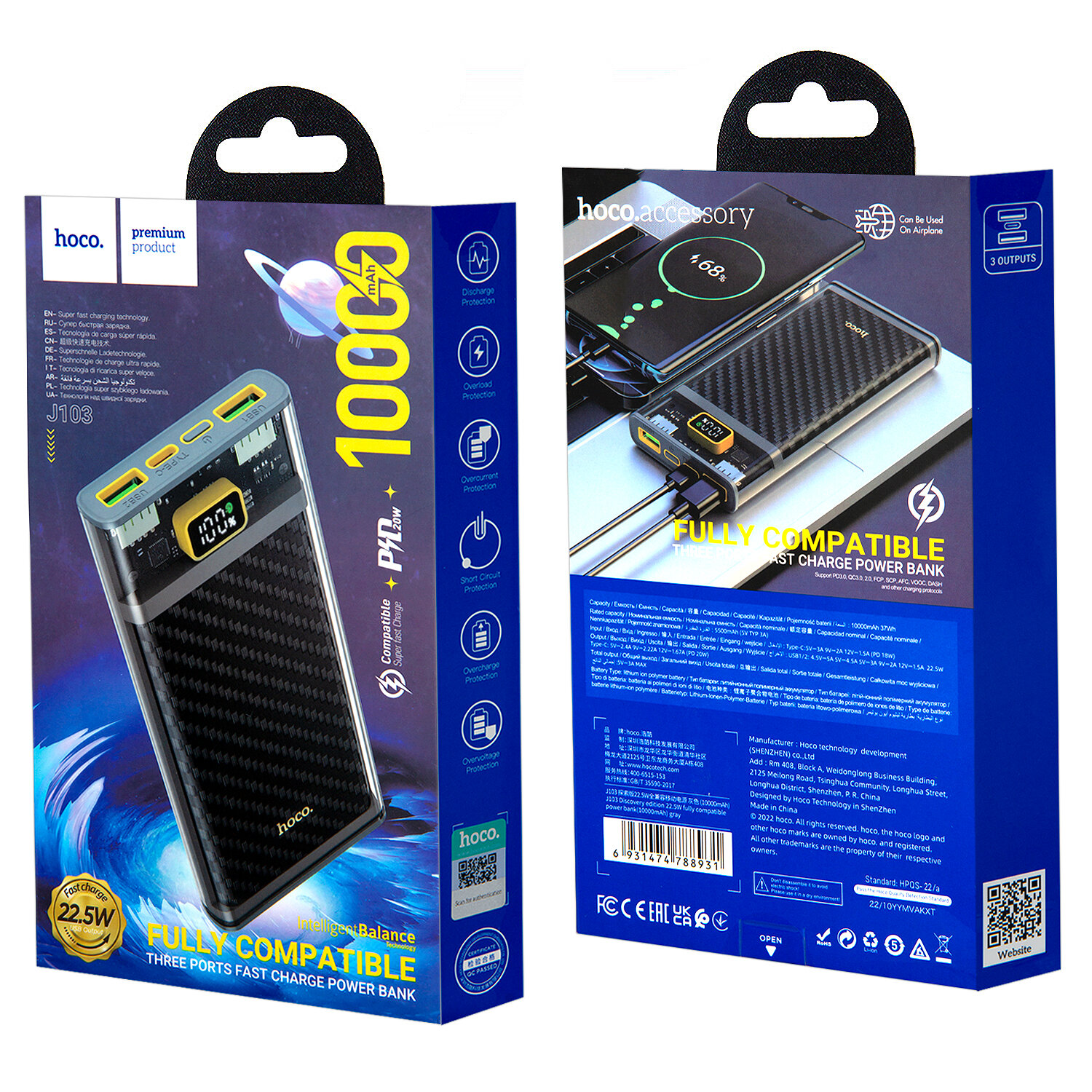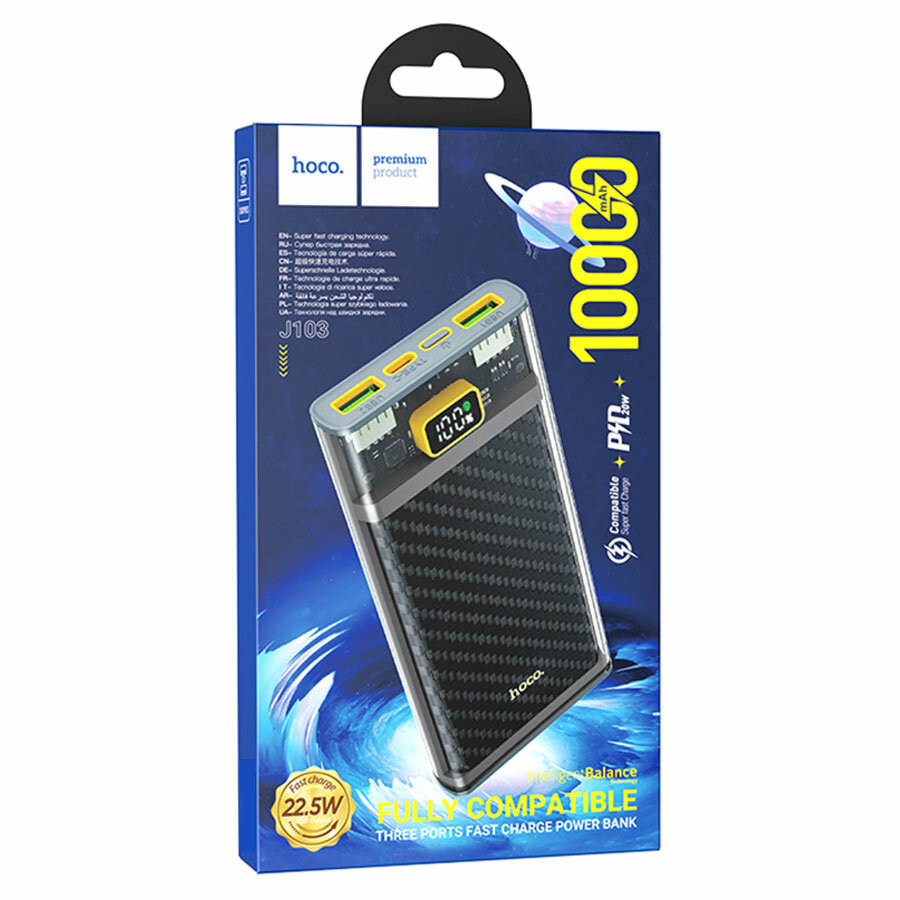 Универсальный Доп. Аккумулятор 10000mAh, J103, HOCO, выход: 2 USB (22.5W)+1 PD (20W), серый