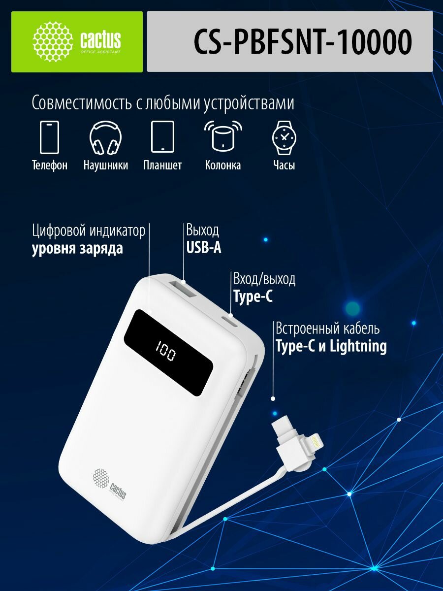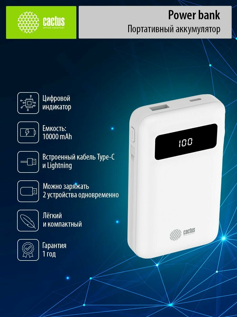 | Комплектация | Внешний аккумулятор Cactus CS-PBFSNT-10000 10000mAh 3A 1xUSB белый |