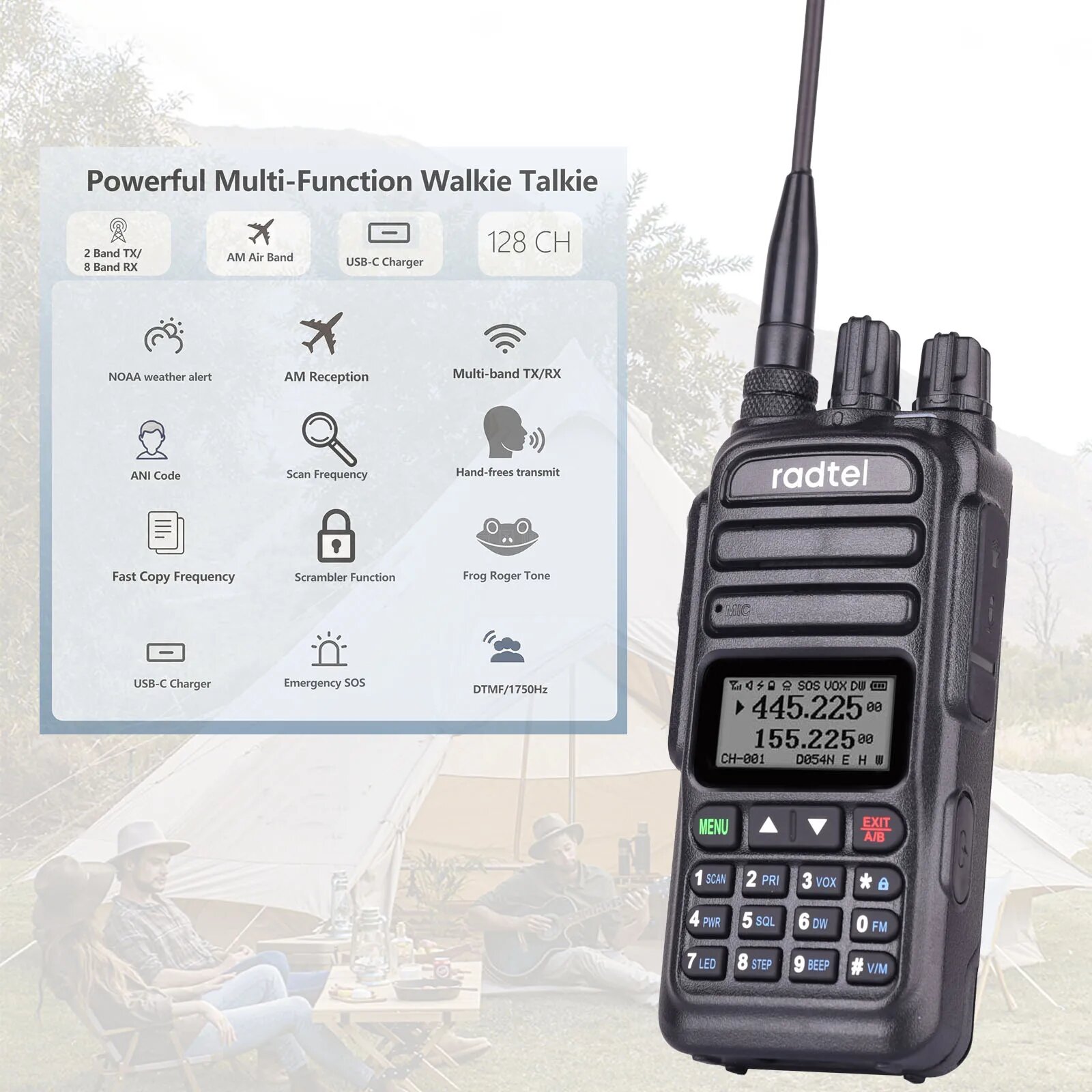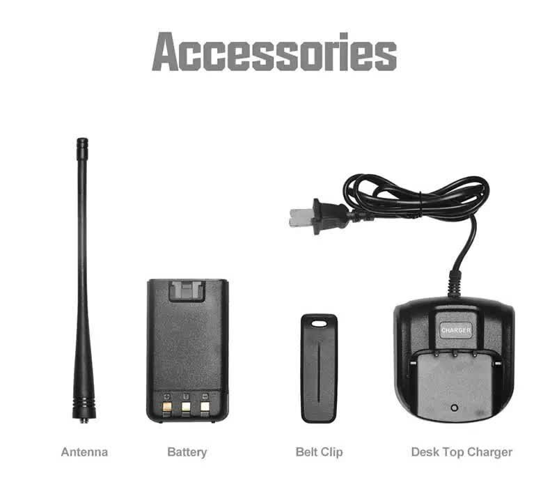 | Особенности | CTCSS, DCS, FM-радиоприемник, голосовая активация через гарнитуру (VOX), прием погодных каналов NOAA, сигнал окончания передачи (Roger Beep), сканирование каналов, скремблер |