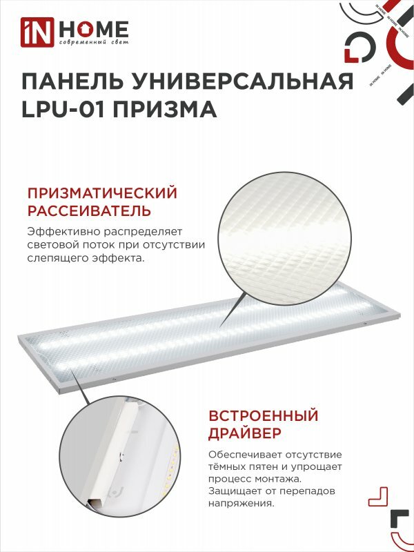 Светодиодная LED панель (светильник) IN HOME универсальная LPU-01 36Вт призма 230В 6500K 3100Лм 180х1195х19мм IP40 4690612029818 интересное: