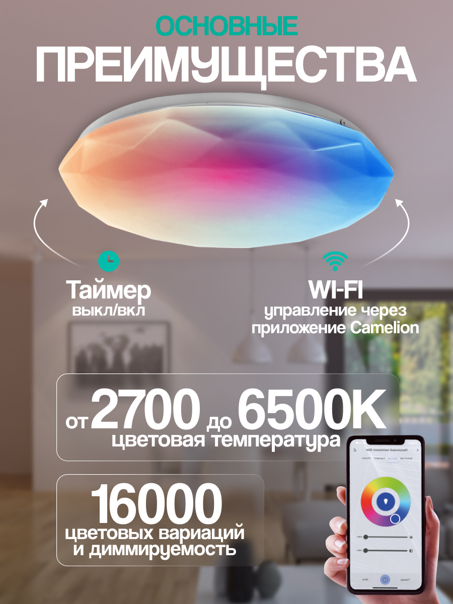 Светильник потолочный умный Camelion SH-48 с Wi-Fi управлением RGBCW