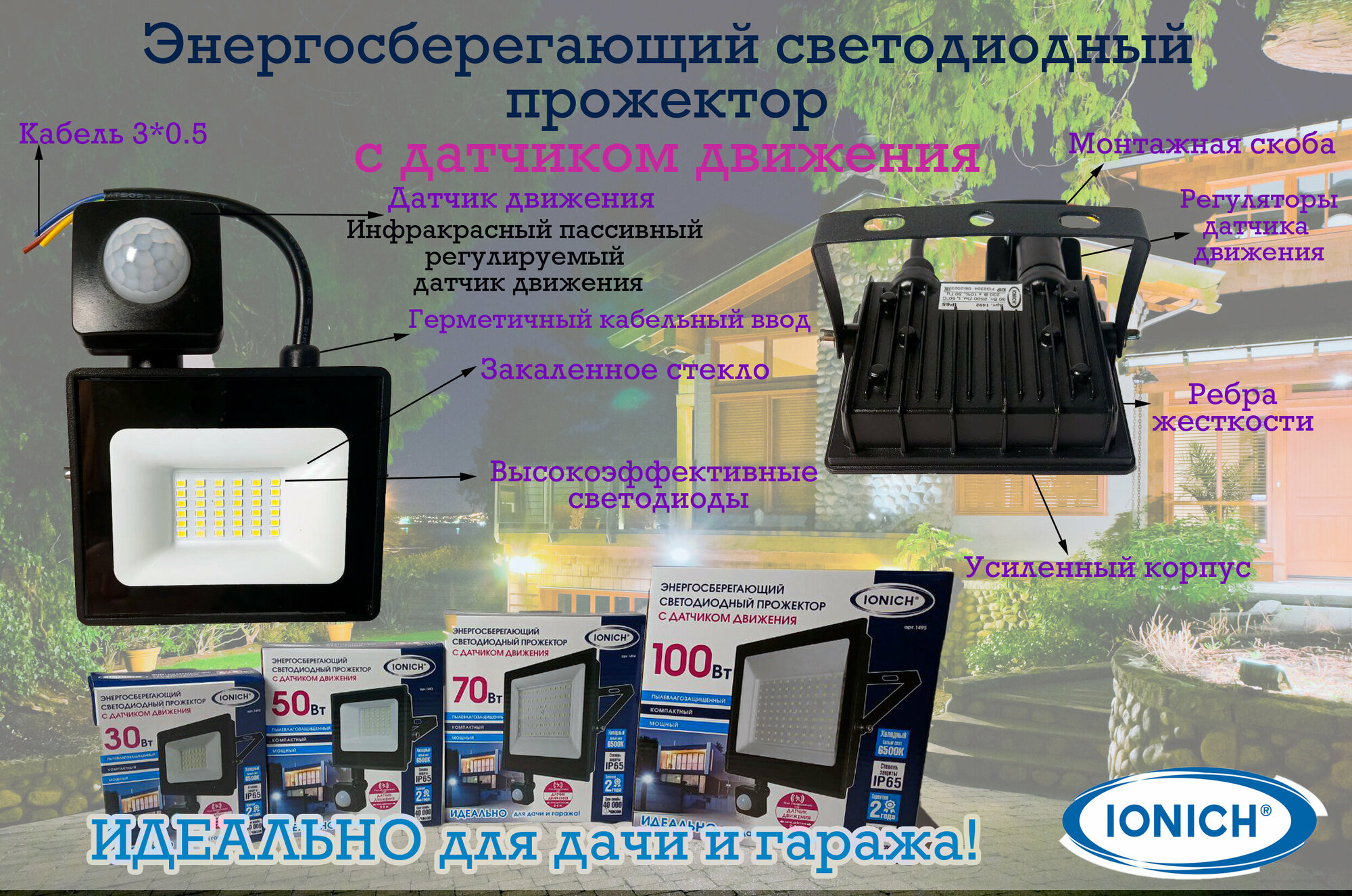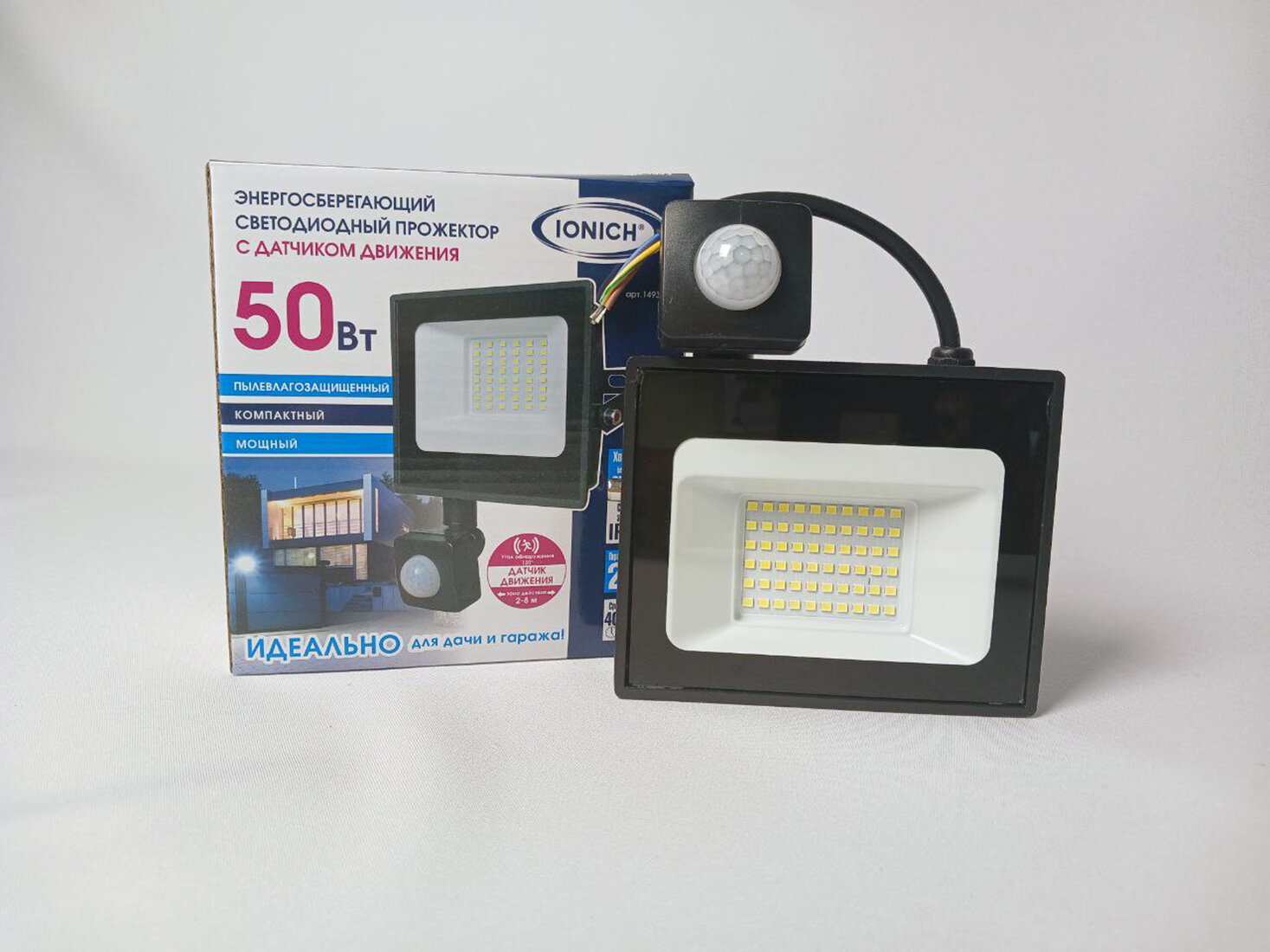 Светодиодные прожекторы с датчиком движения IONICH 50 ватт интересное:
