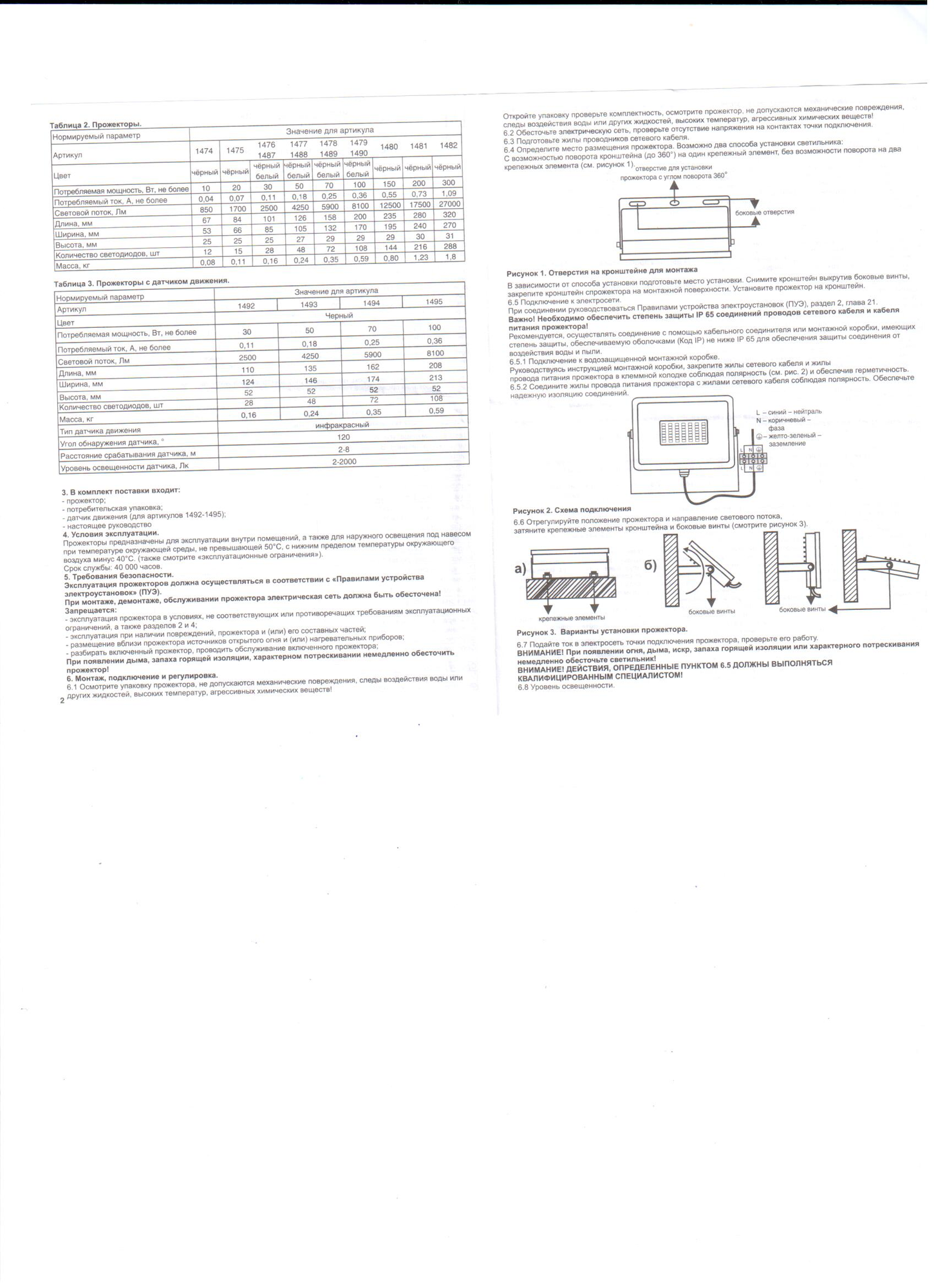 | Дополнительная информация | Регуляторы датчика движения :1. Чувствительность датчика от расстояния минимальная чувствительность около 2 м; максимальная чувствительность около 8м. 2.Таймер. Время работы прожектора устанавливается в диапазоне от 5 секунд до 6 минут. 3. Уровень освещенности. "Солнце" датчик работает круглые сутки; "Луна" датчик работает только в темное время суток. |