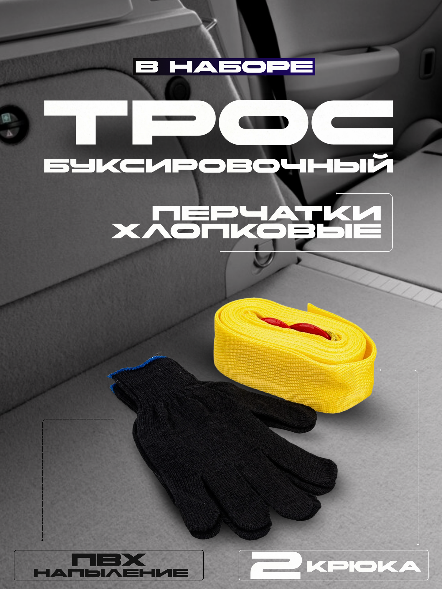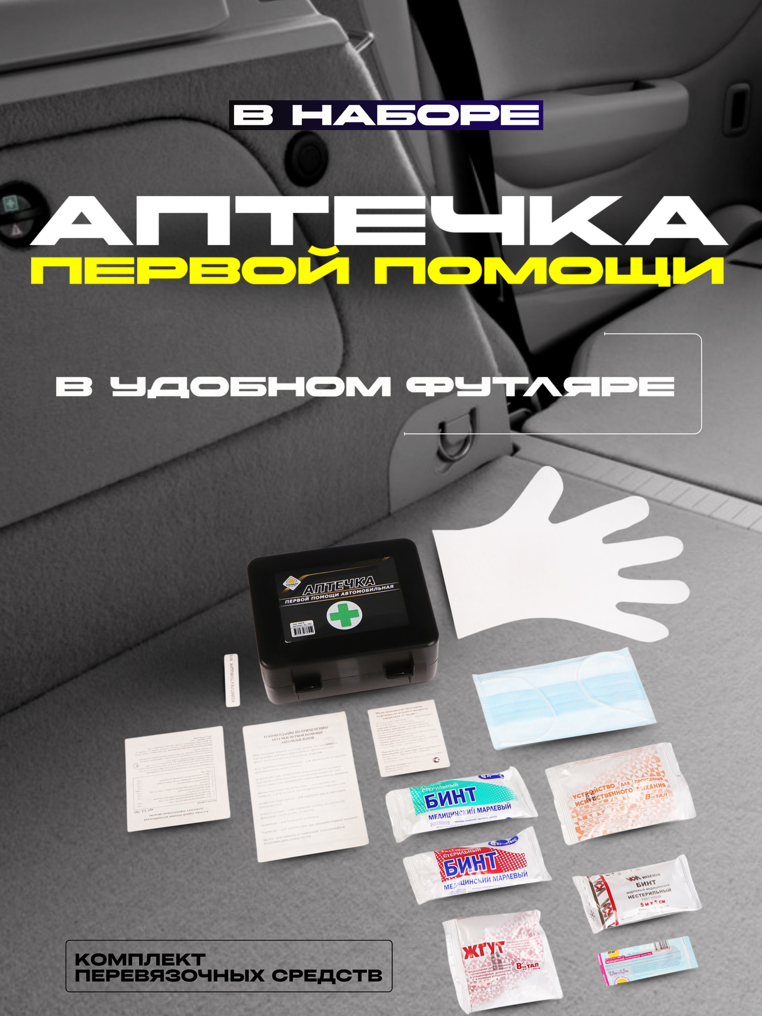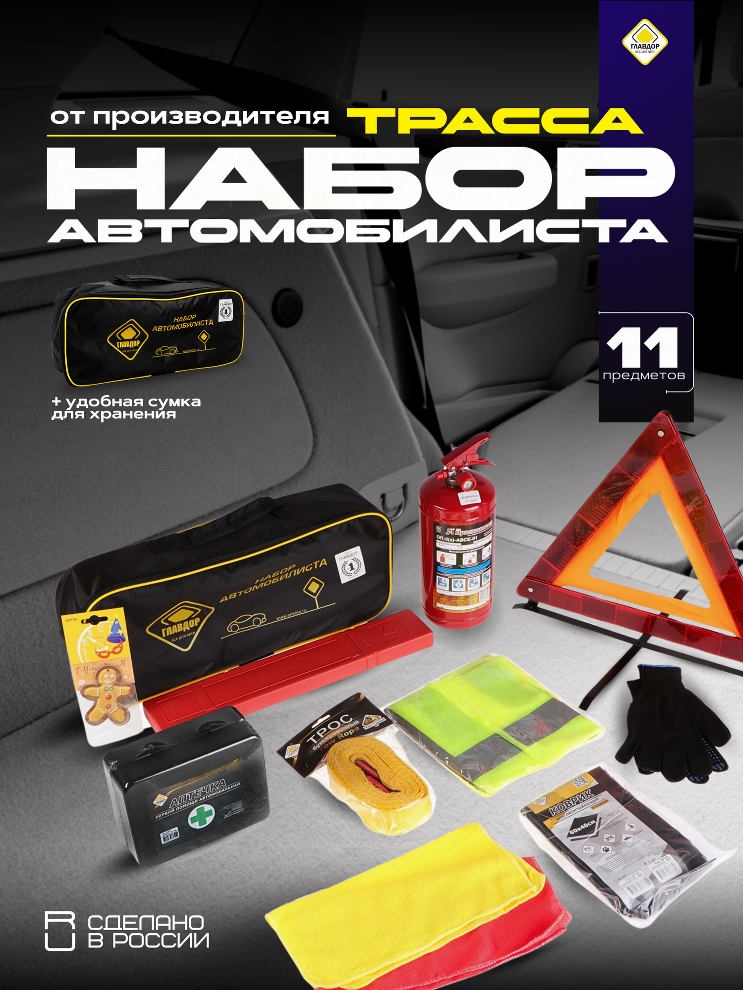| В наборе | аптечка / жилет светоотражающий / знак аварийной остановки / огнетушитель / перчатки / трос буксировочный |