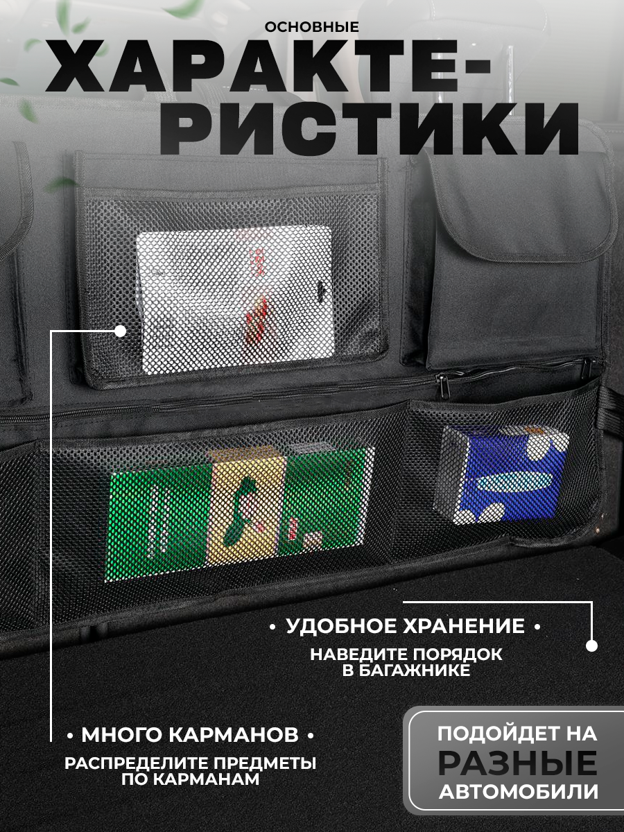 Органайзер подвесной для хранения вещей в багажник на спинку сиденья для автомобиля с карманами, 100 см. Кофр в авто. интересное: