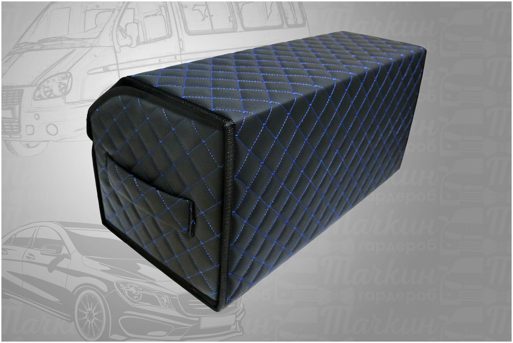 Аксессуары для авто/Органайзер в багажник 60х30х30 рисунок квадрат черный сстрочка синяя