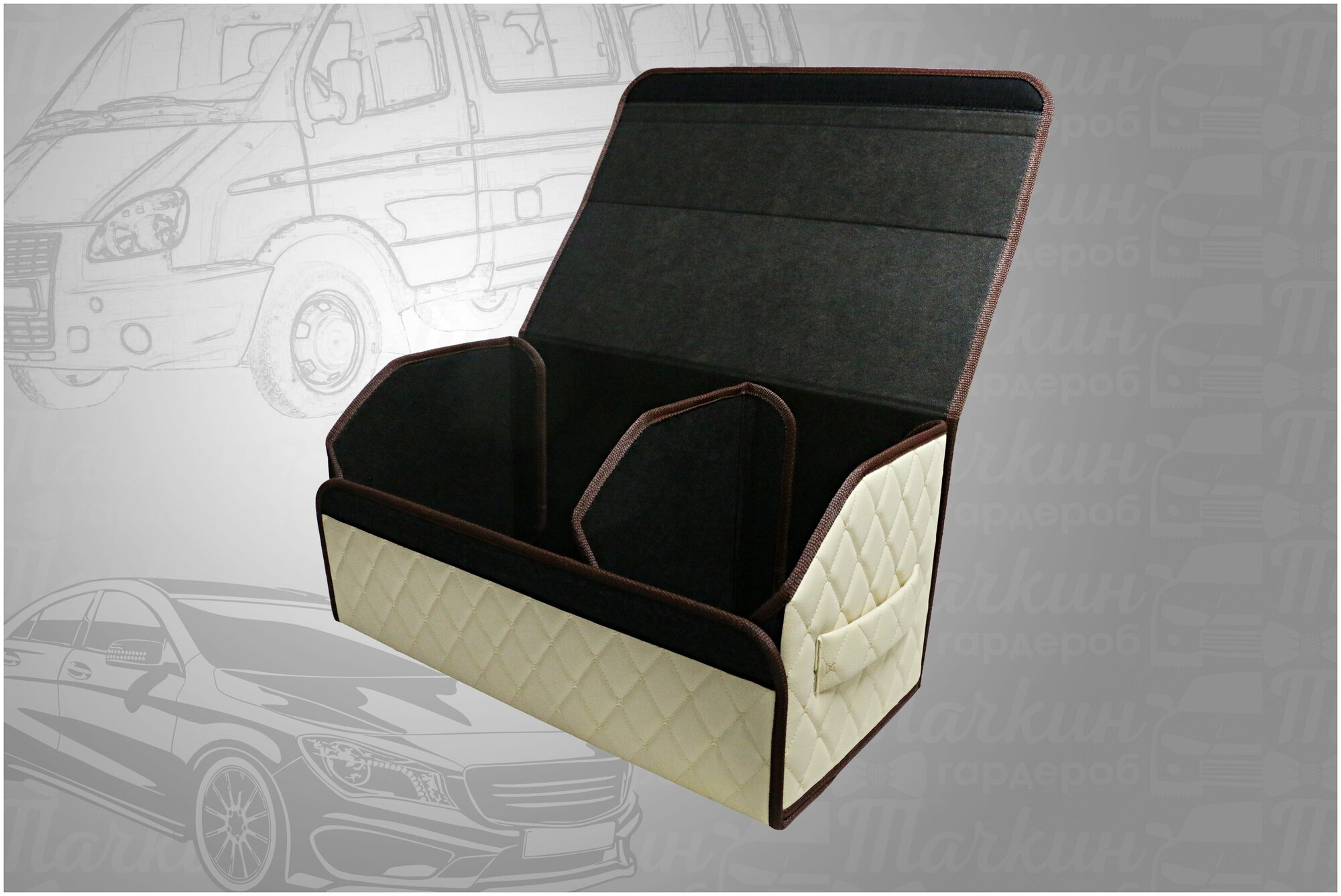 Аксессуары для авто/Органайзер в багажник 60х30х30 рисунок фигурный ромб бежевый строчка беж/окантовка корич