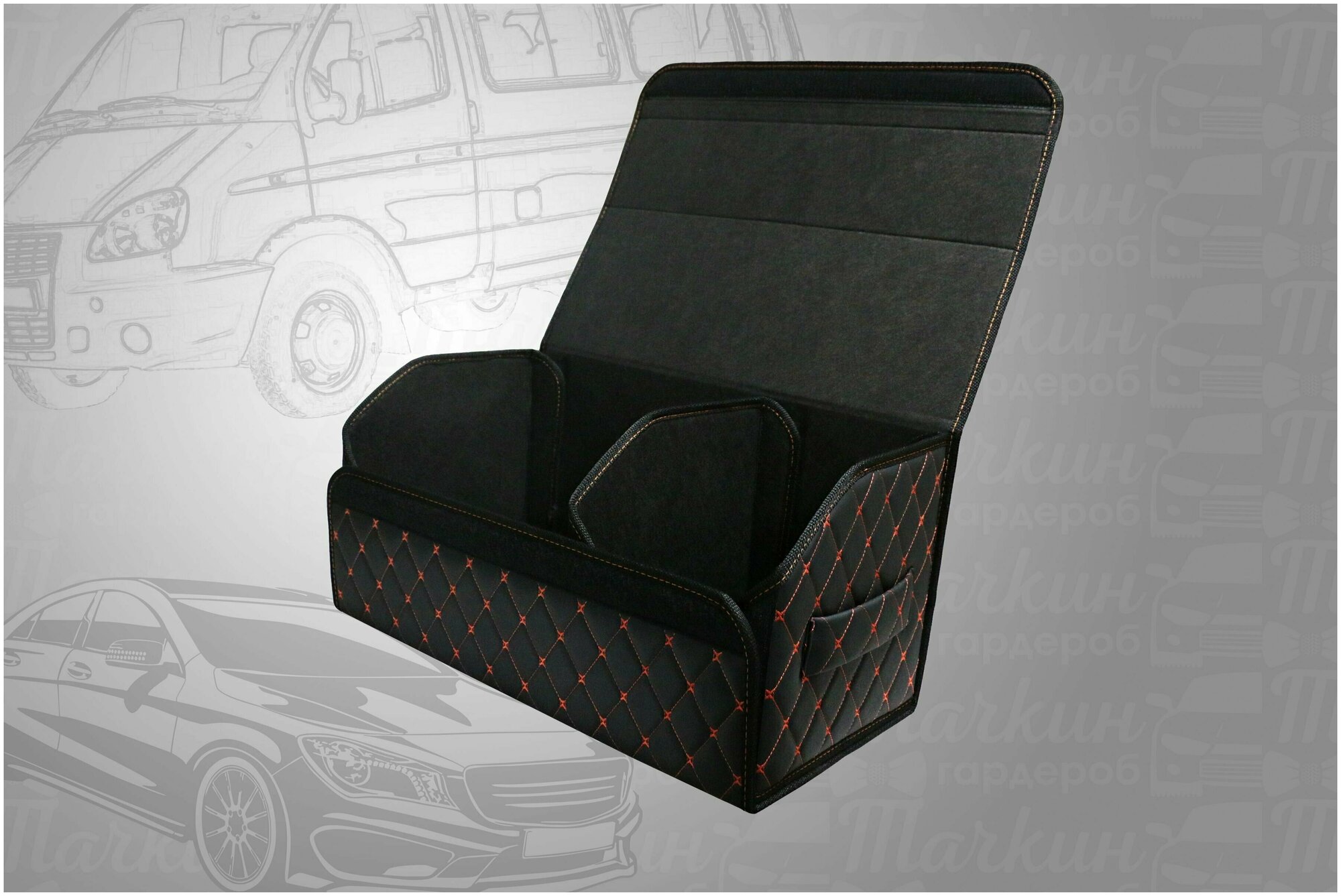 Аксессуары для авто/Органайзер в багажник 60*30*35 рисунок квадрат черный строчка красная /черная окант