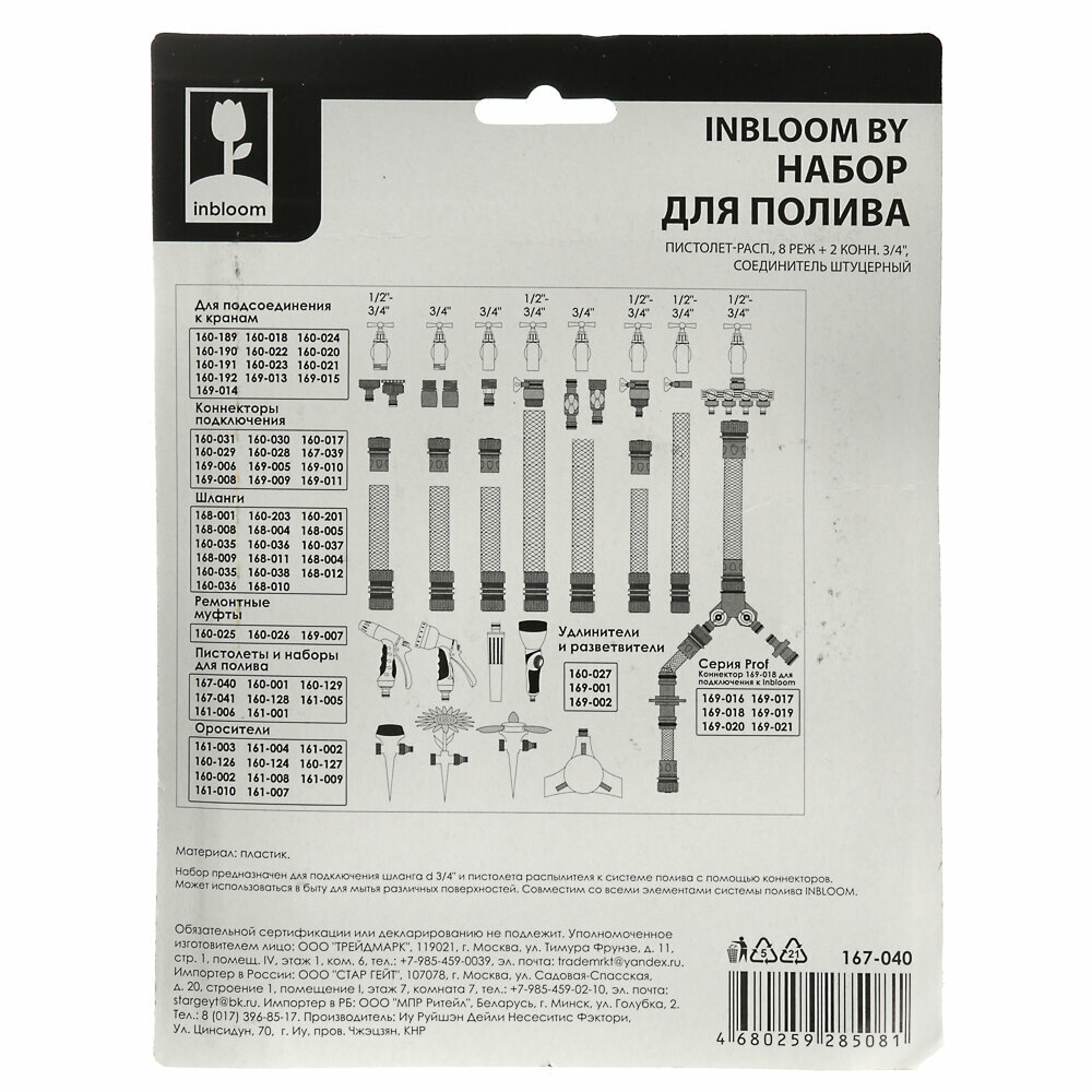 | Дополнительная информация | Набор садовый для полива INBLOOM пистолет 8 реж./переходник 2шт./ штуцер 3/4' (167-040) |