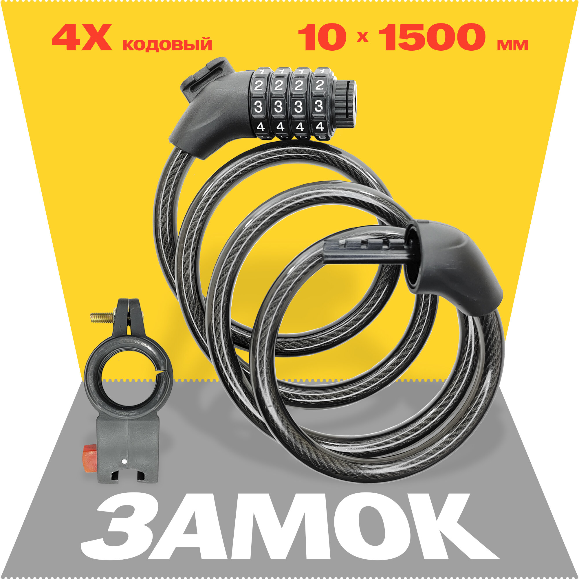 Замок для велосипеда кодовый противоугонный тросовый, 10х1500 мм, кронштейн для рамы, m705, Тайвань интересное: