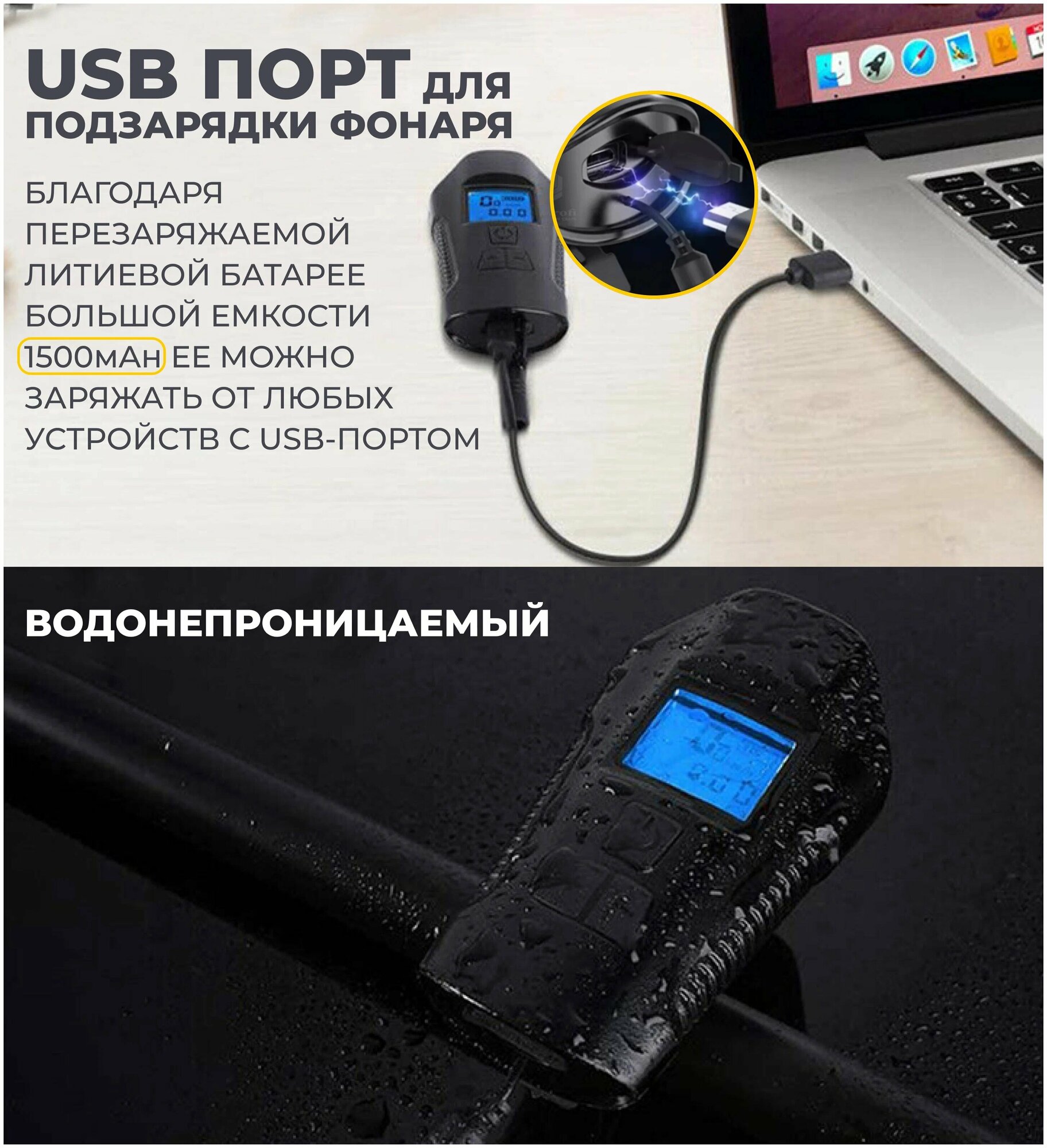 | Особенности | USB-зарядка / влагозащищенный / выносная кнопка переключения режимов / звуковой сигнал / индикатор заряда / регулировка угла наклона / ударопрочный / функция памяти |