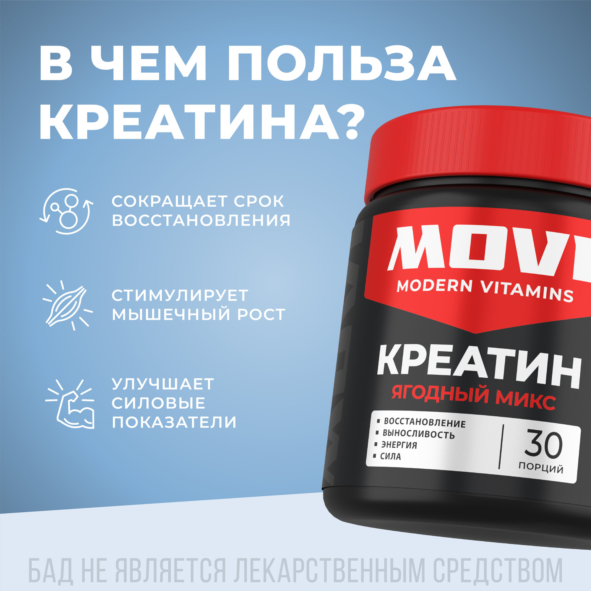 Креатин моногидрат порошок MOVI, Creatine Monohydrate, Вкус Ягодный микс, 30 порций, 200 г, спортивное питание для набора массы тела интересное:
