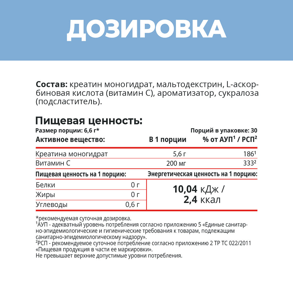 | Дополнительная информация | Состав: креатина моногидрат, капсула желатиновая (желатин, оксид цинка - краситель), микрокристаллическая целлюлоза (носитель). |