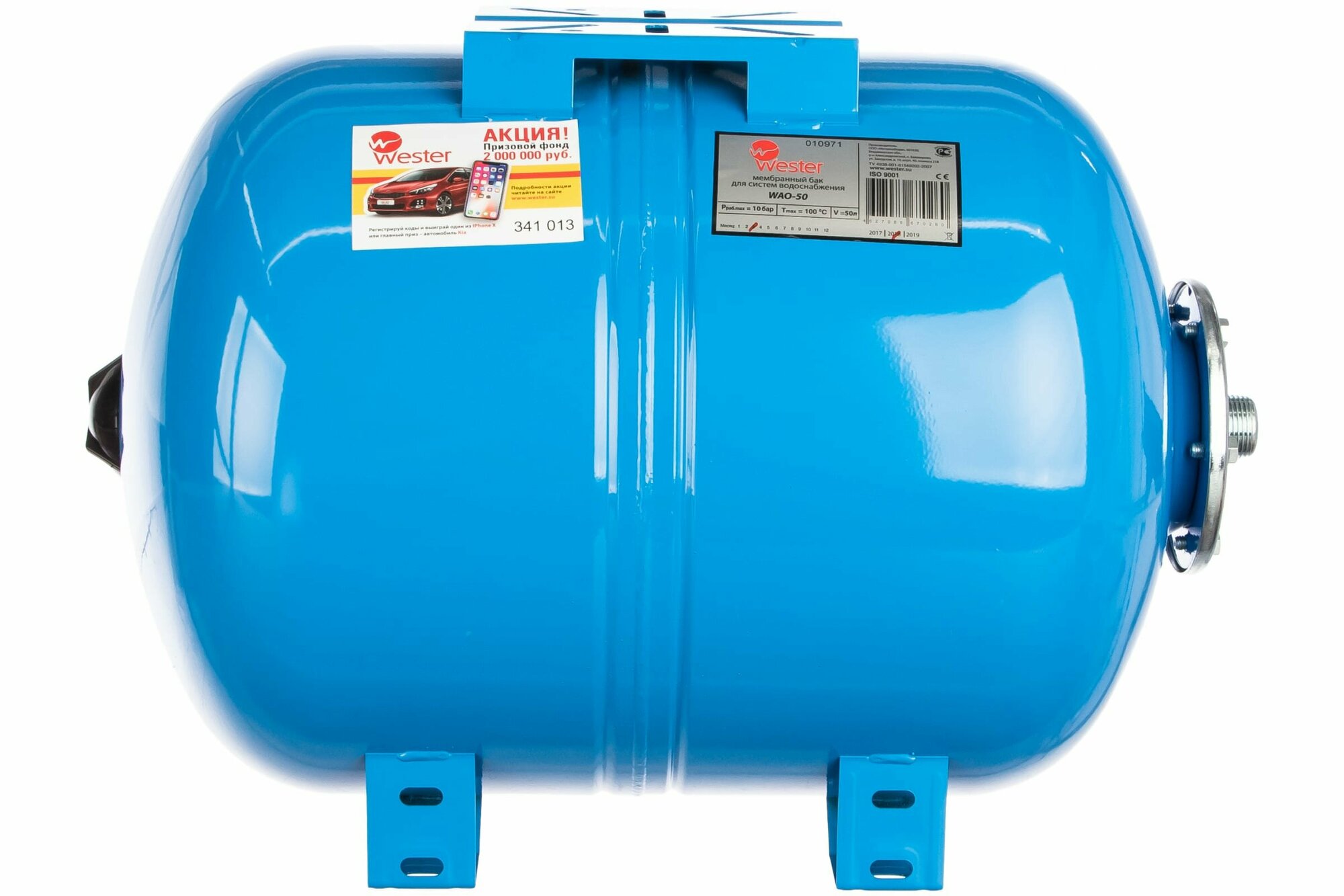 Гидроаккумулятор 50 литров WAO50 Wester 10 бар Россия, горизонтальный с площадкой для насоса, синий для водоснабжения 0-14-0970