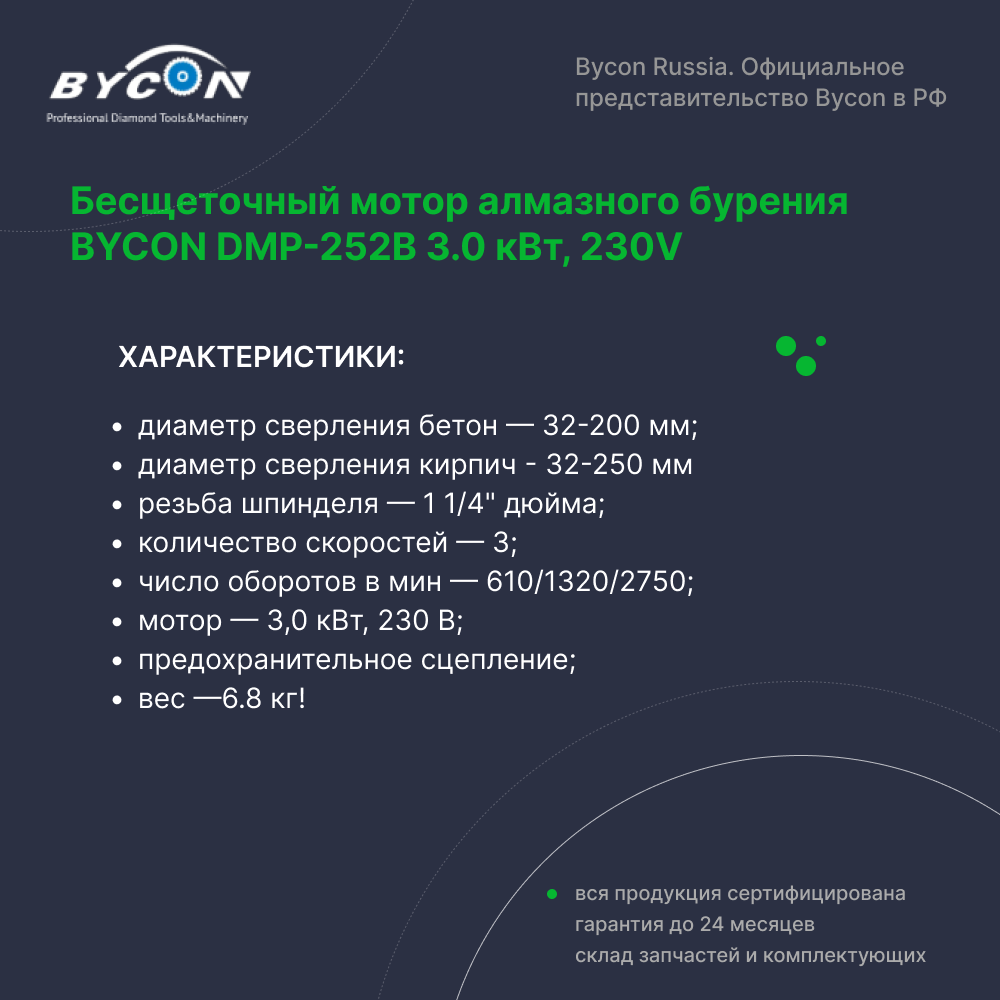 Ниже Вы можете прочитать отзывы на Бесщеточный мотор алмазного бурения Bycon DMP-252B Байкон, ознакомится с подробными характеристиками, посмотреть интересные обзоры и фотографии на Бесщеточный мотор алмазного бурения Bycon DMP-252B Байкон.