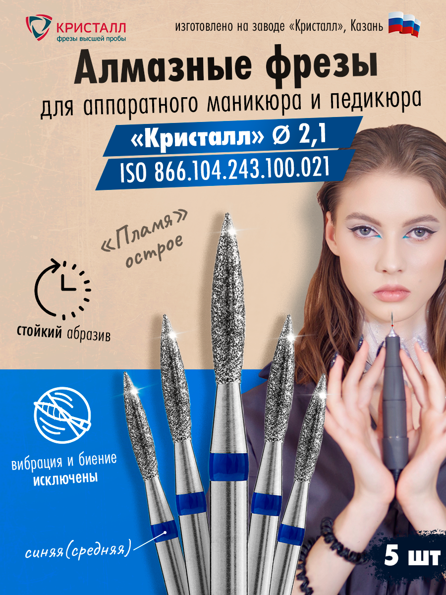 Кристалл, Алмазная фреза (пламя острое), D2,1, L100, средняя, 866.104.243.100.021, 5 шт интересное: