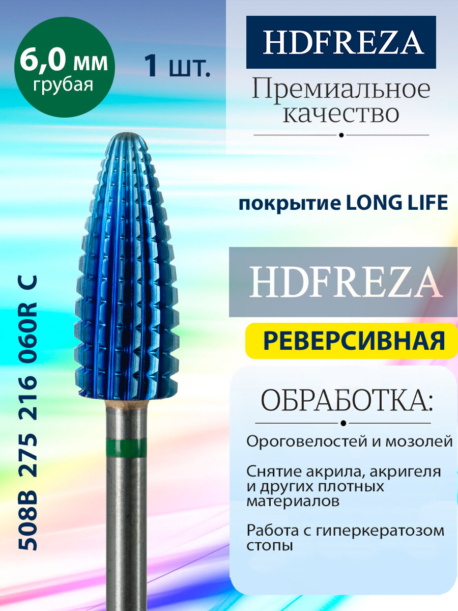 HDFREZA Фреза для маникюра и педикюра твердосплавная реверсивная 508B 275 176 060R Средняя синяя конус d-6.0