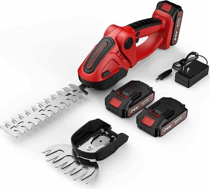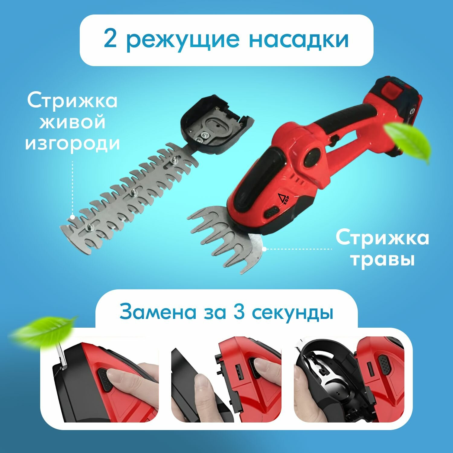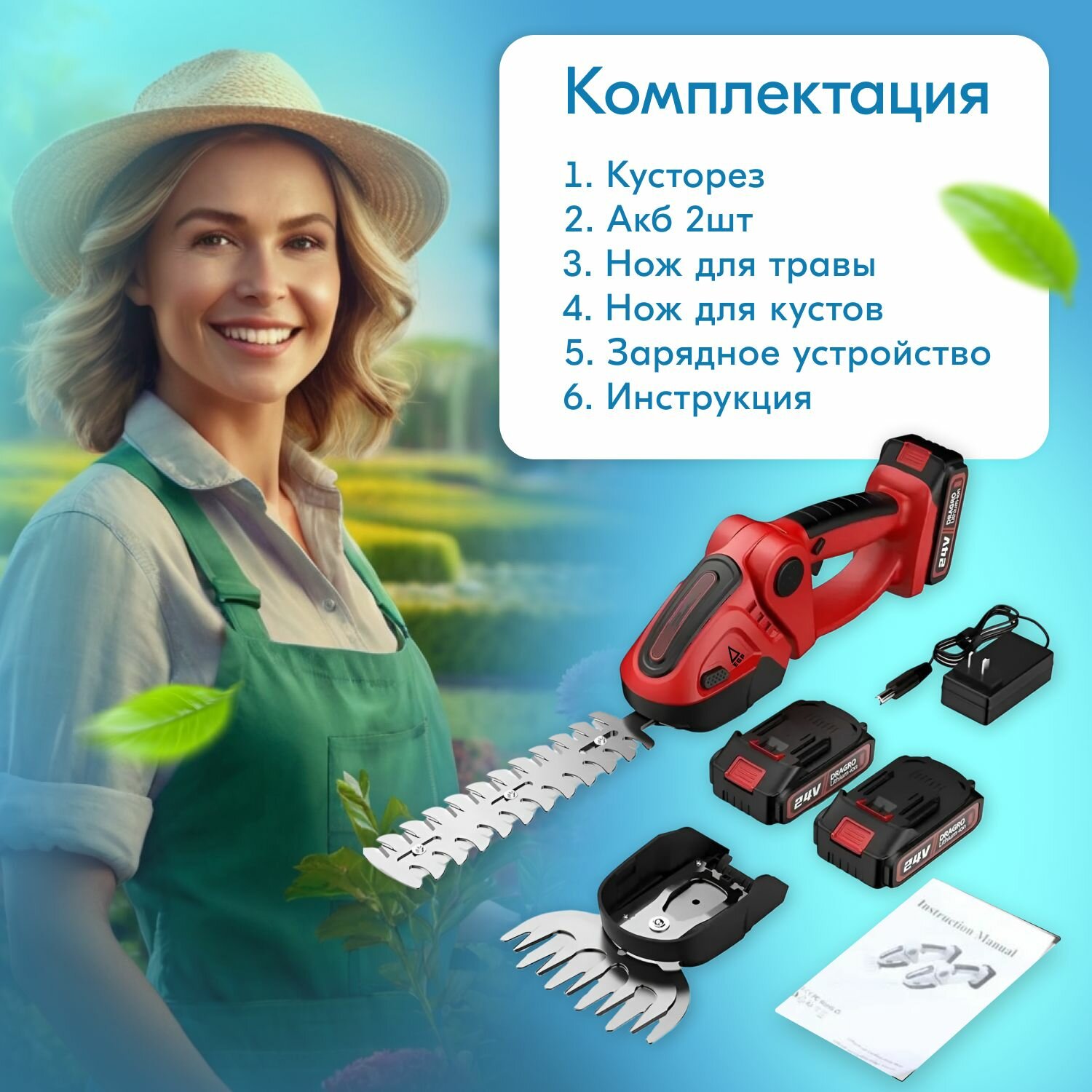 | Комплектация | Аккумуляторный кусторез, аккумулятор (2 шт.), зарядное устройство с проводом, насадка для травы и насадка для кустарников, инструкция по применению , упаковка |