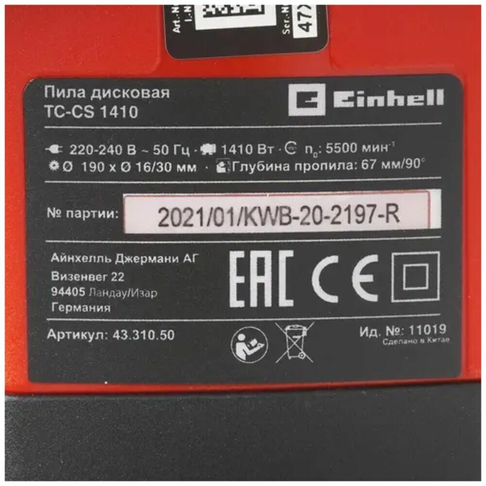 Циркулярная пила Einhell TC-CS 1410 Вт, 190 мм, 5500 об/мин, 4331050