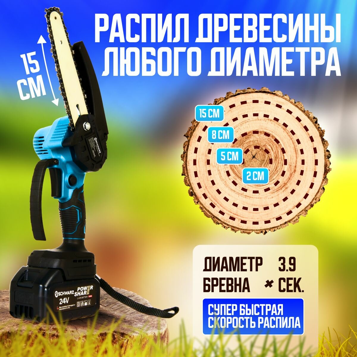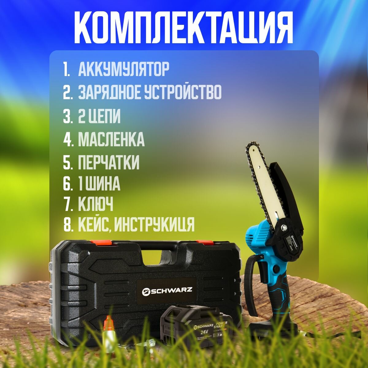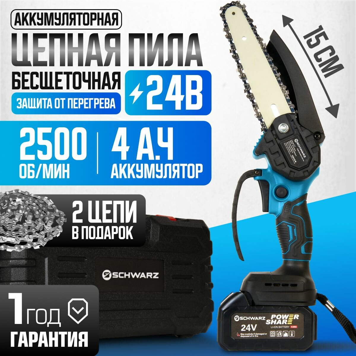 Аккумуляторная цепная мини-пила, кусторез 24В, 700 Вт, 4.0Ач, 2500об/мин интересное: