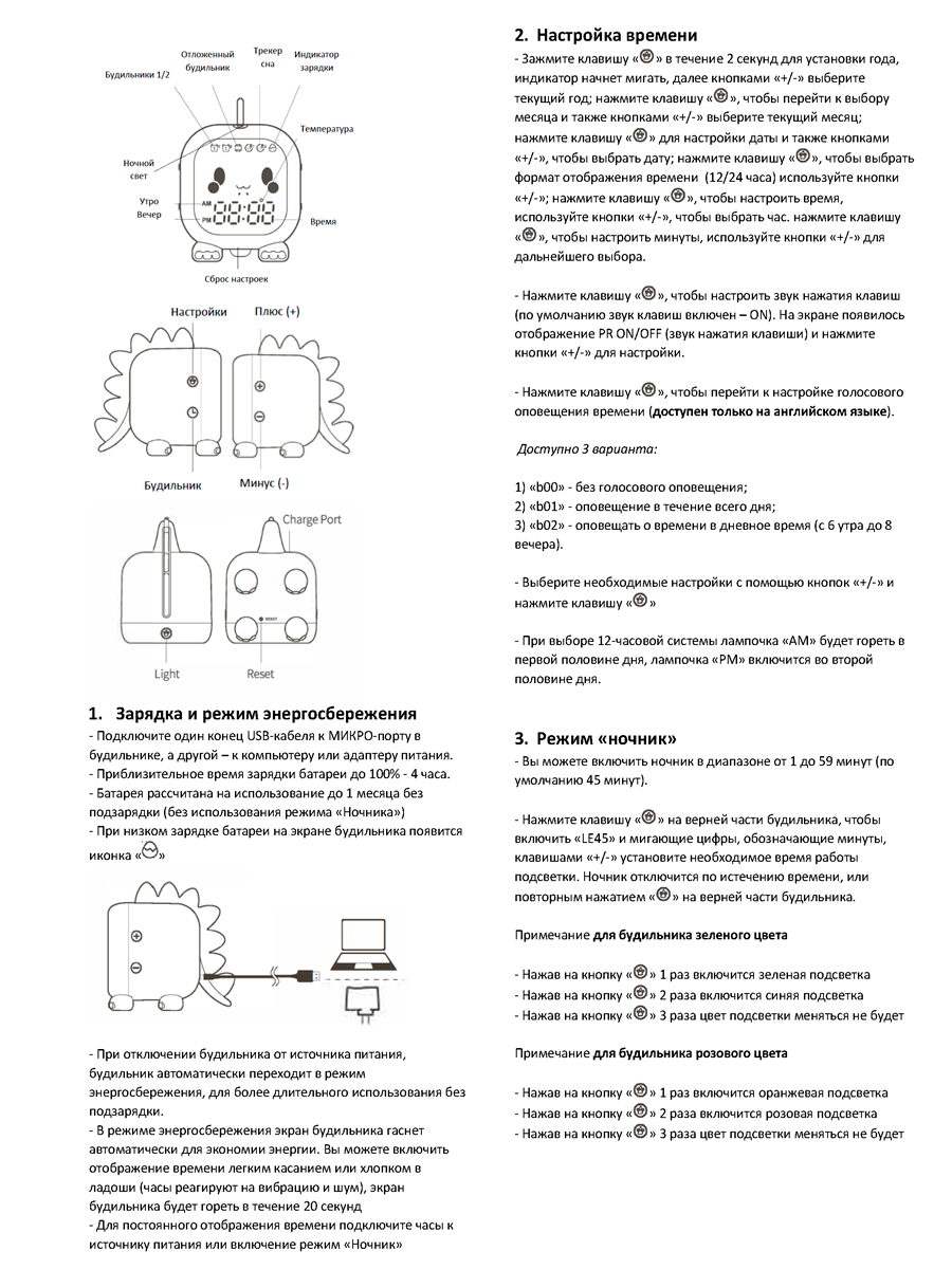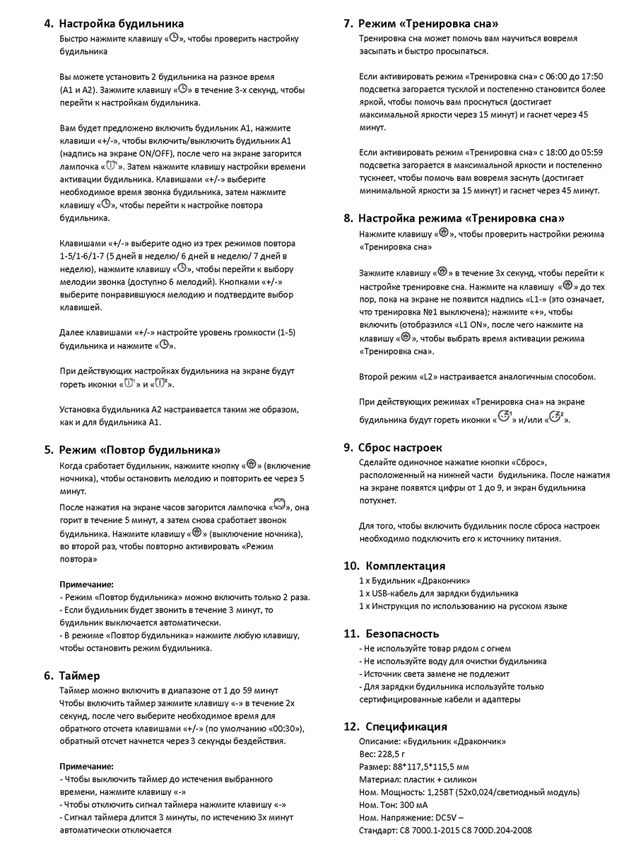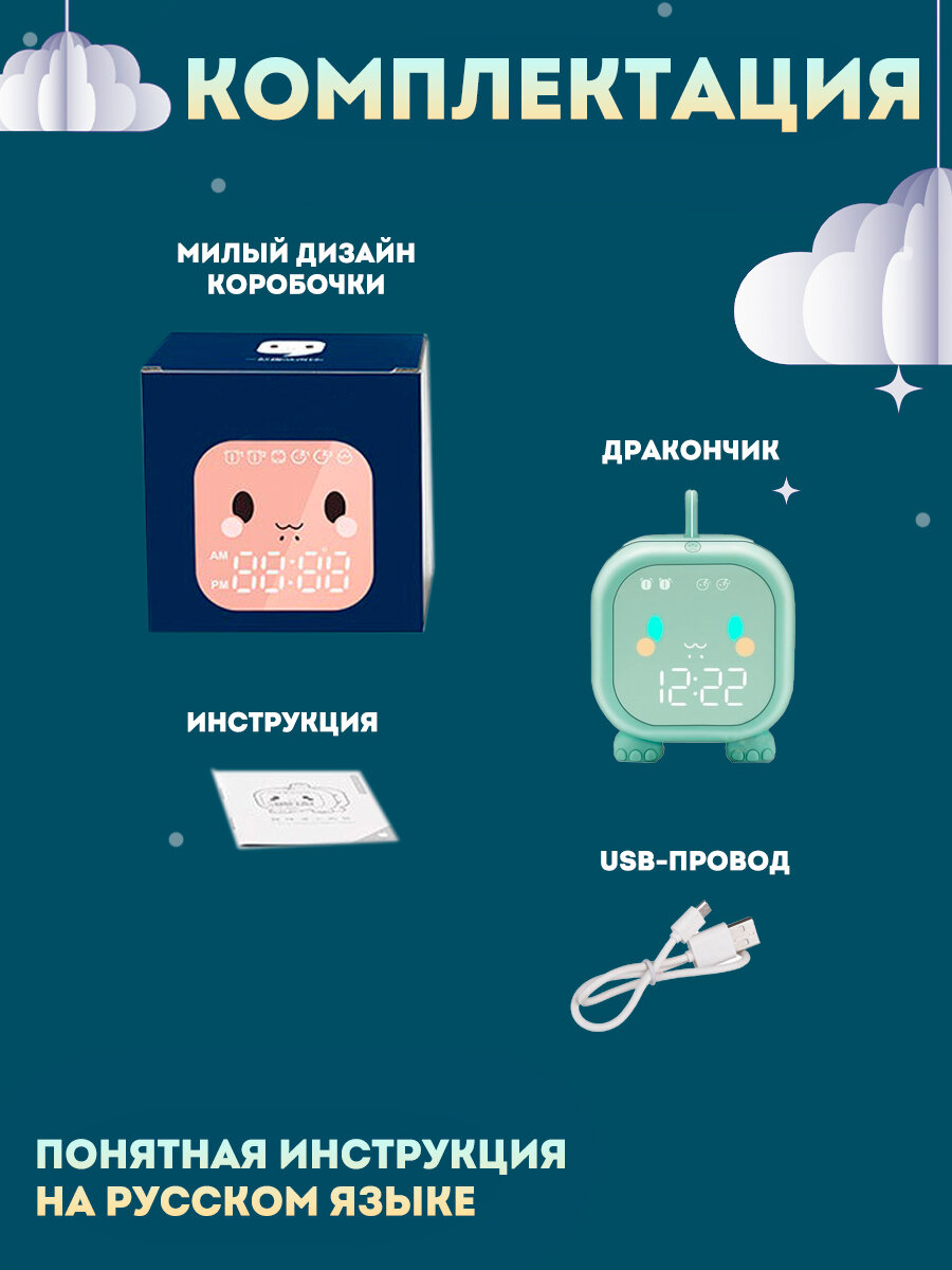 | Комплектация | Будильник - 1 шт.; USB-кабель - 1 шт.; инструкция на русском языке - 1 шт.; упаковка - 1 шт. |