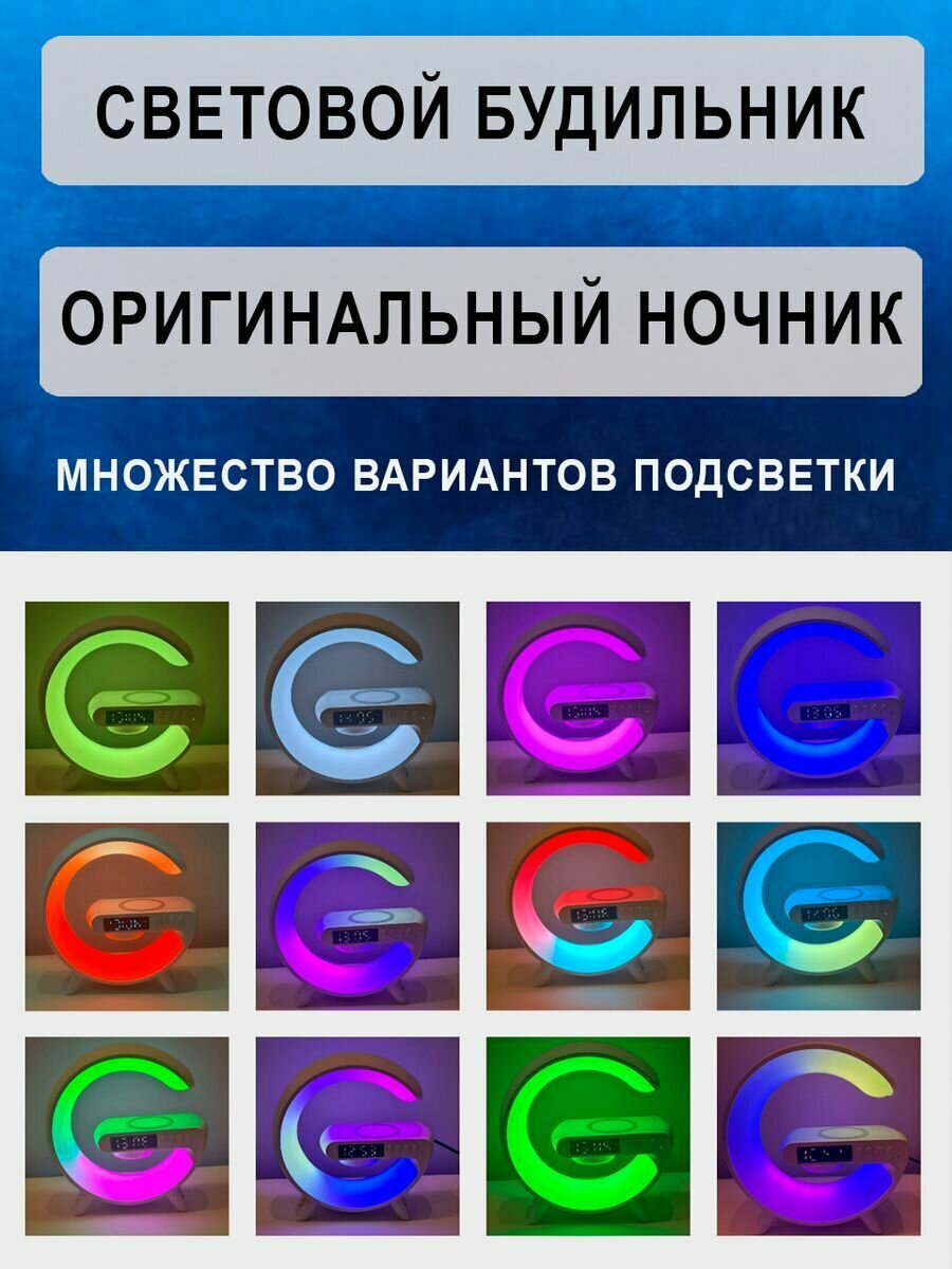 Световой будильник с беспроводной зарядкой для смартфона, с ночником, часами и встроенной колонкой Bluetooth