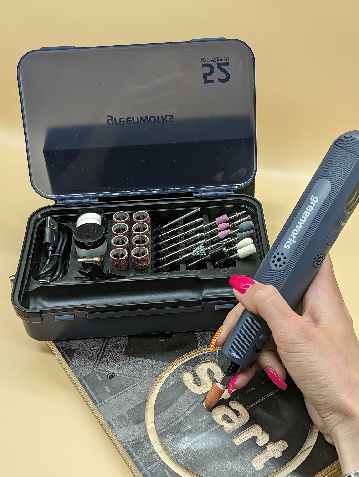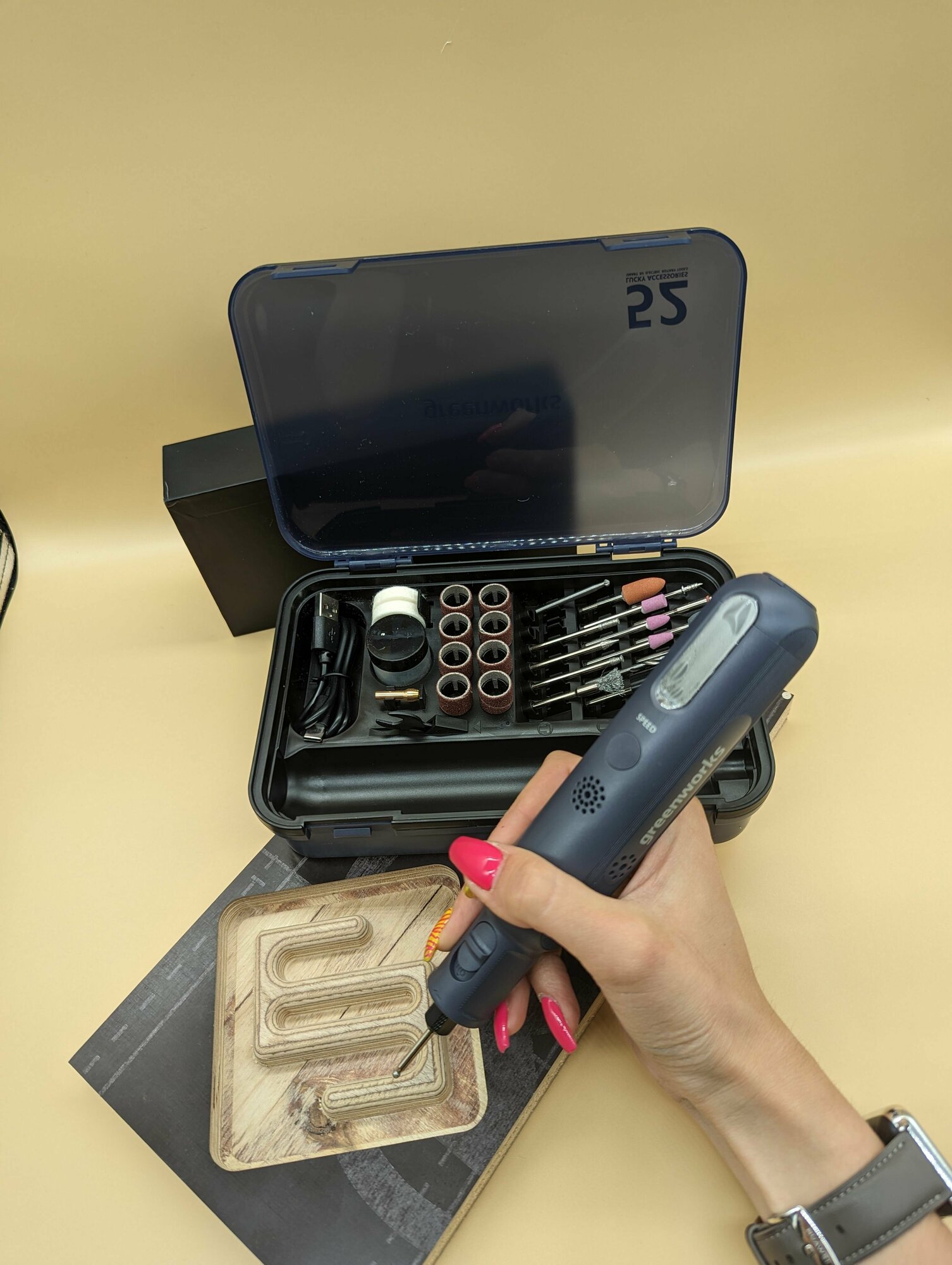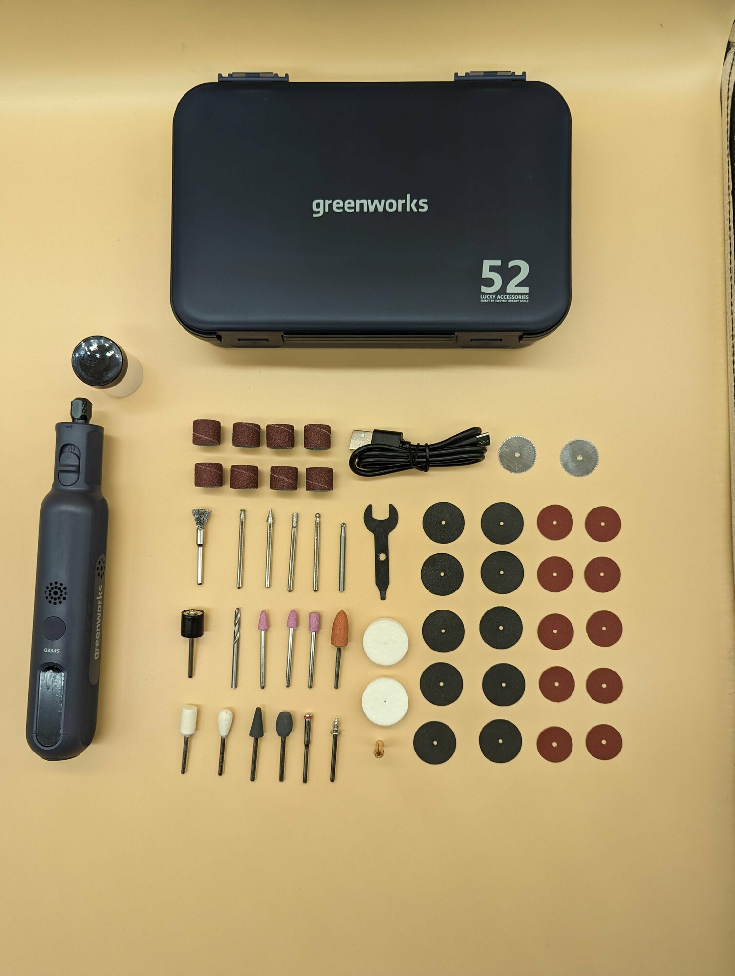 | Комплектация | Мини шлифовальная greenworks машина со встроенным аккумулятором Пластиковый кейс для оснасток и гравера 52 аксессуара Провод для зарядки USB Type-C |