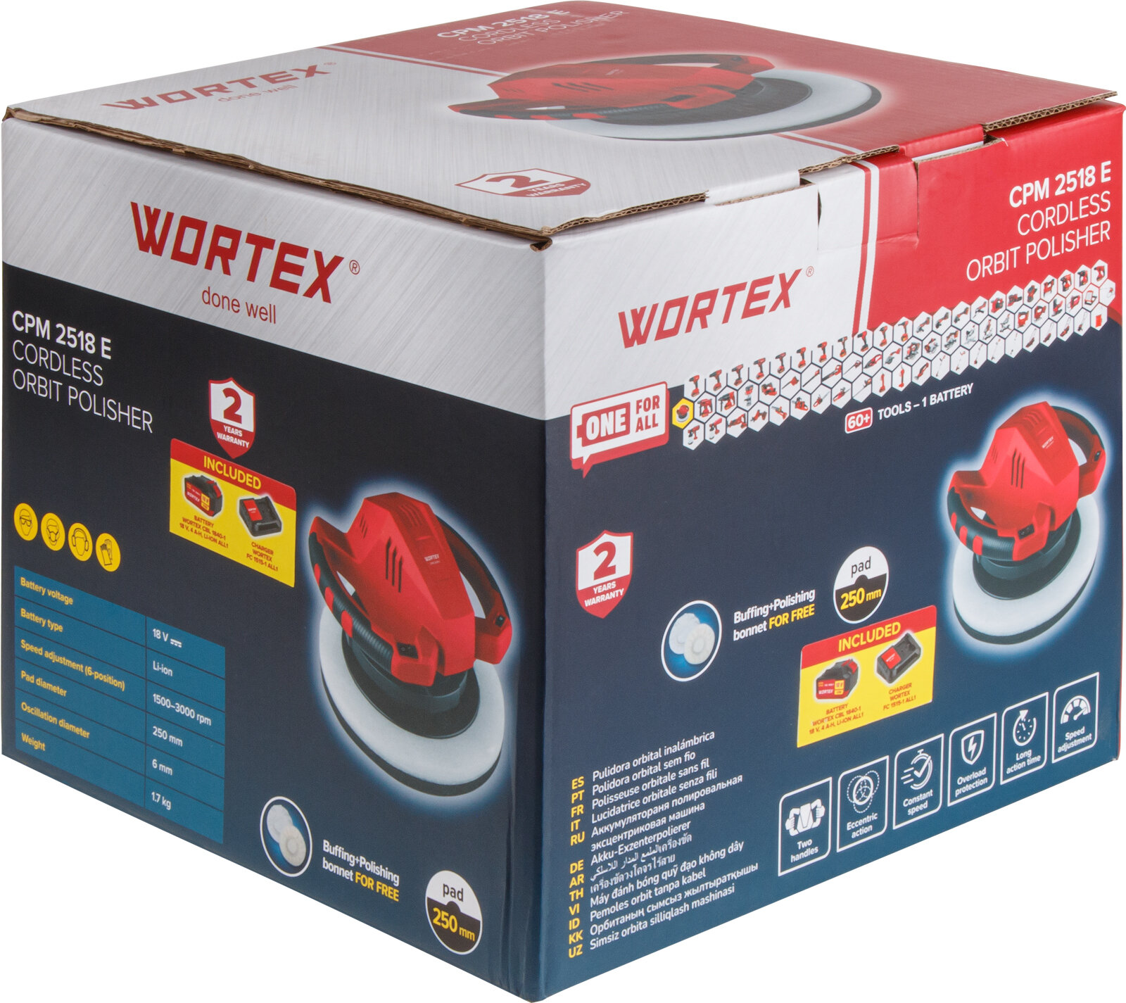 | Комплектация | Машина полировальная аккумуляторная WORTEX CPM 2518 E ALL1, Полировальная насадка 250 мм (хлопок) - 1 шт., Полировальная насадка 250 мм (ткань) - 1 шт., Аккумулятор Wortex CBL 1840-1 - 1 шт., Зарядное устройство FC 1515-1 - 1 шт., Инструкция. |