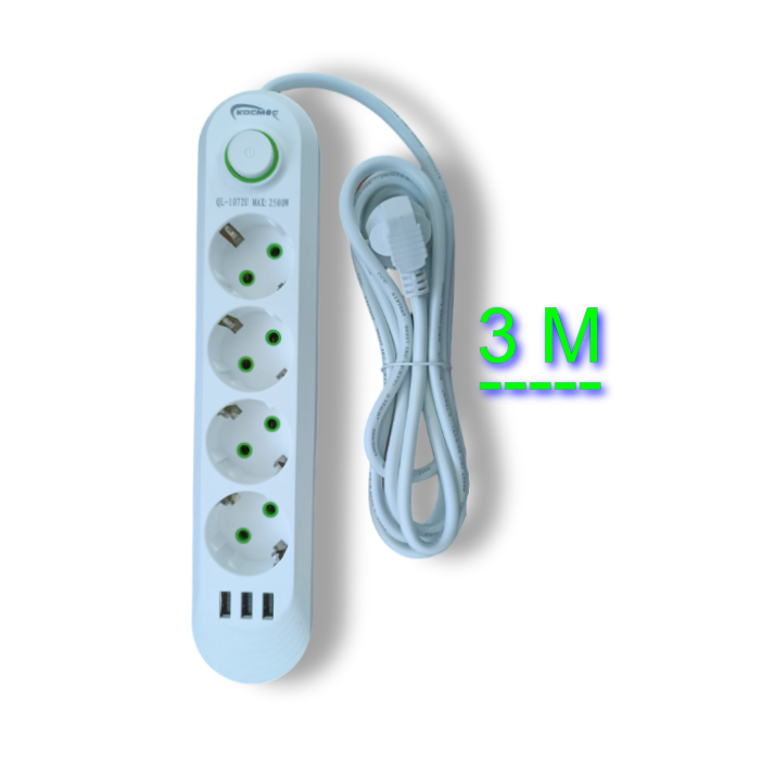 Купить Сетевой фильтр, удлинитель, 4 розетки, 3 USB, 3 метра, белый, 10А