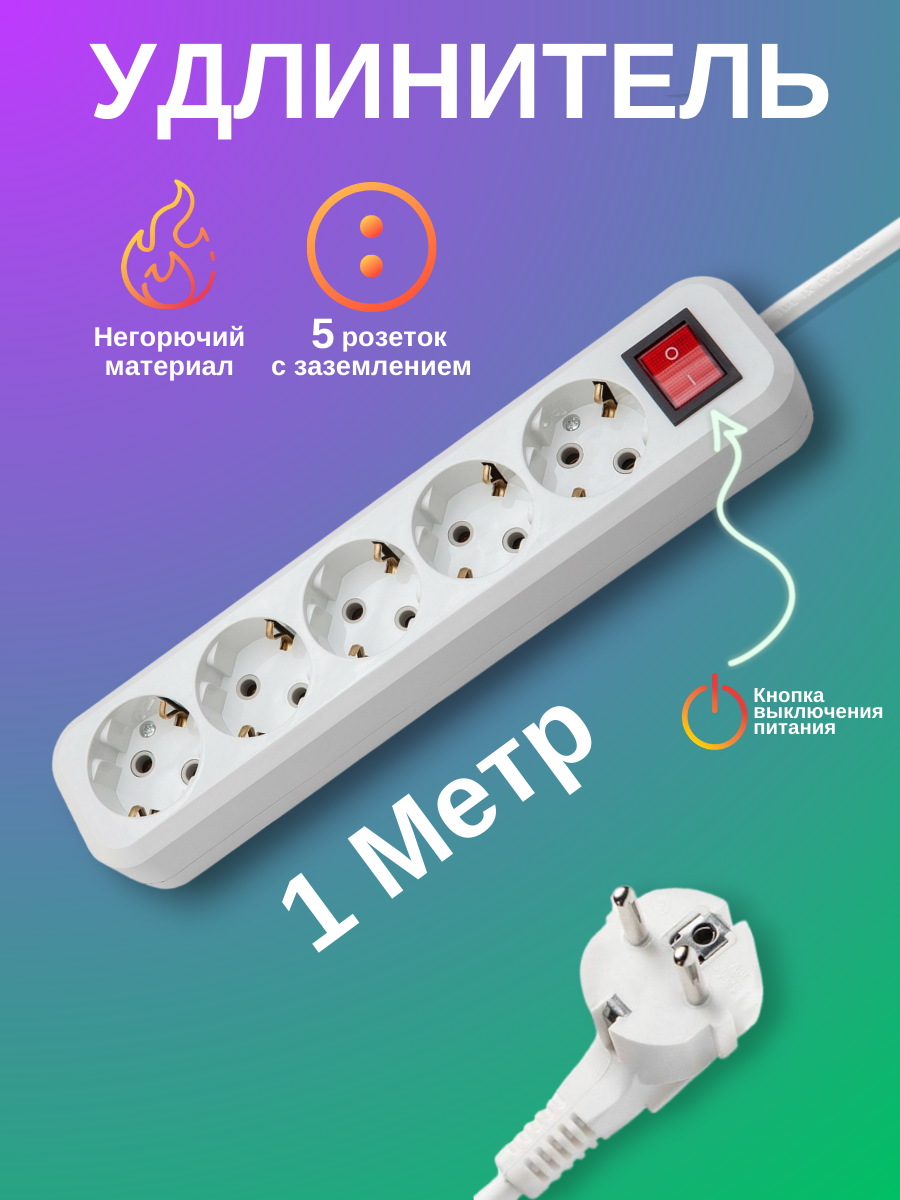 Сетевой фильтр удлинитель с выключателем - 5 розеток, 1 метр, заземление интересное: