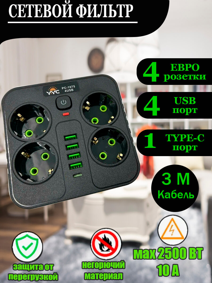 Сетевой фильтр удлинитель 4 розетки с USB type-C интересное: