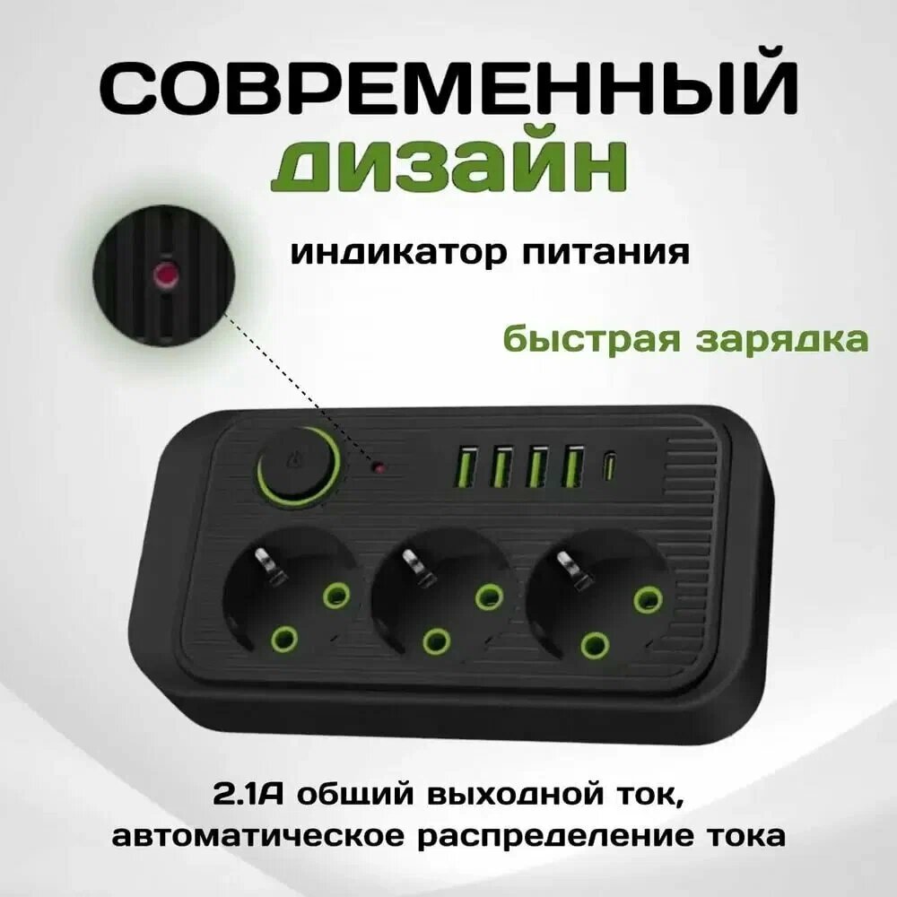 Сетевой фильтр 2606 с 6 розетками 2USB + 1 Type-C / Многофункциональный удлинитель с предохранителем