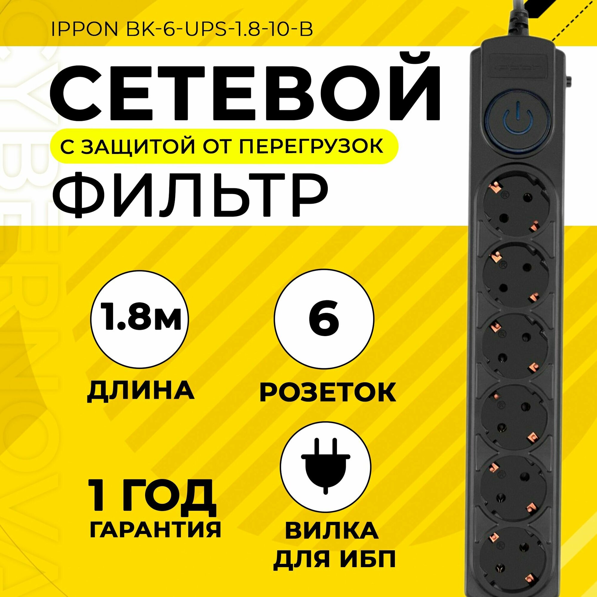 Сетевой фильтр Ippon BK-6-UPS-1.8-10-B 1.8м (6 розеток) черный (коробка) интересное: