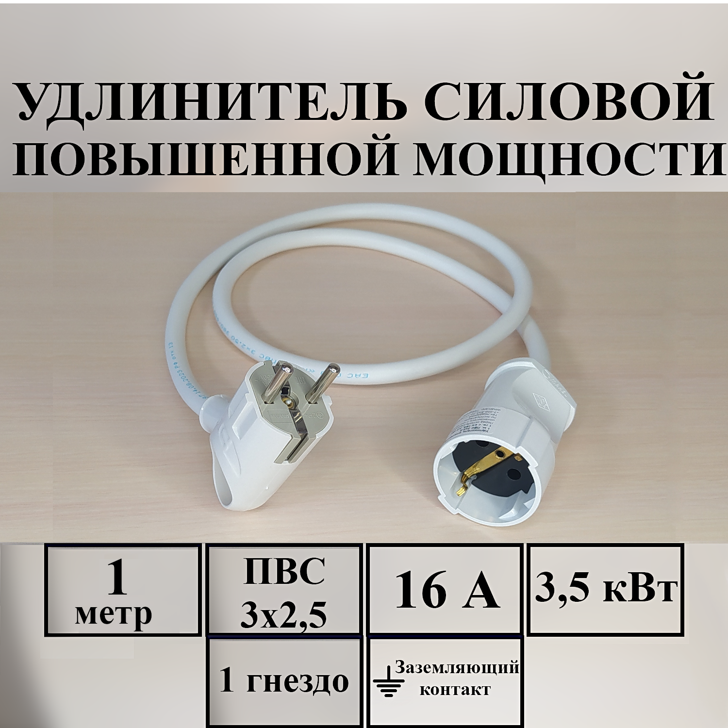 Удлинитель-шнур силовой электрический 1 м, 1 гн, 16 А, 3,5 кВт, ПВС 3х2,5 ГОСТ с з/к