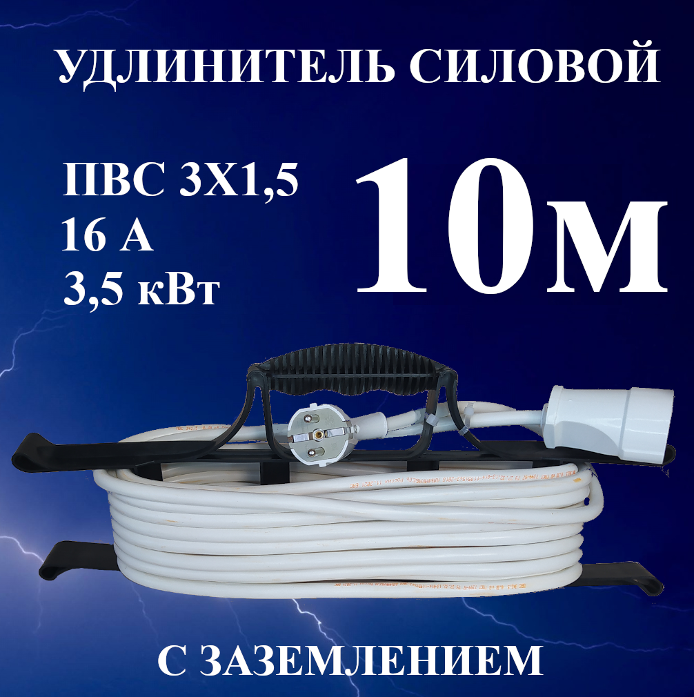 Удлинитель-шнур силовой электрический 10 м, 1 гн, 16 А, 3,5 кВт, ПВС 3х1,5 ГОСТ с з/к