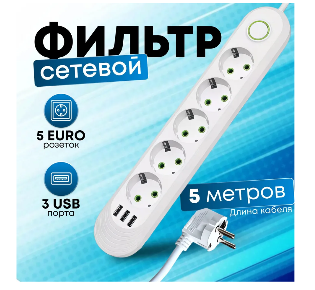 Сетевой фильтр с 5 розетками и 3 USB-портами, 5 метров, 10A, белый цвет интересное: