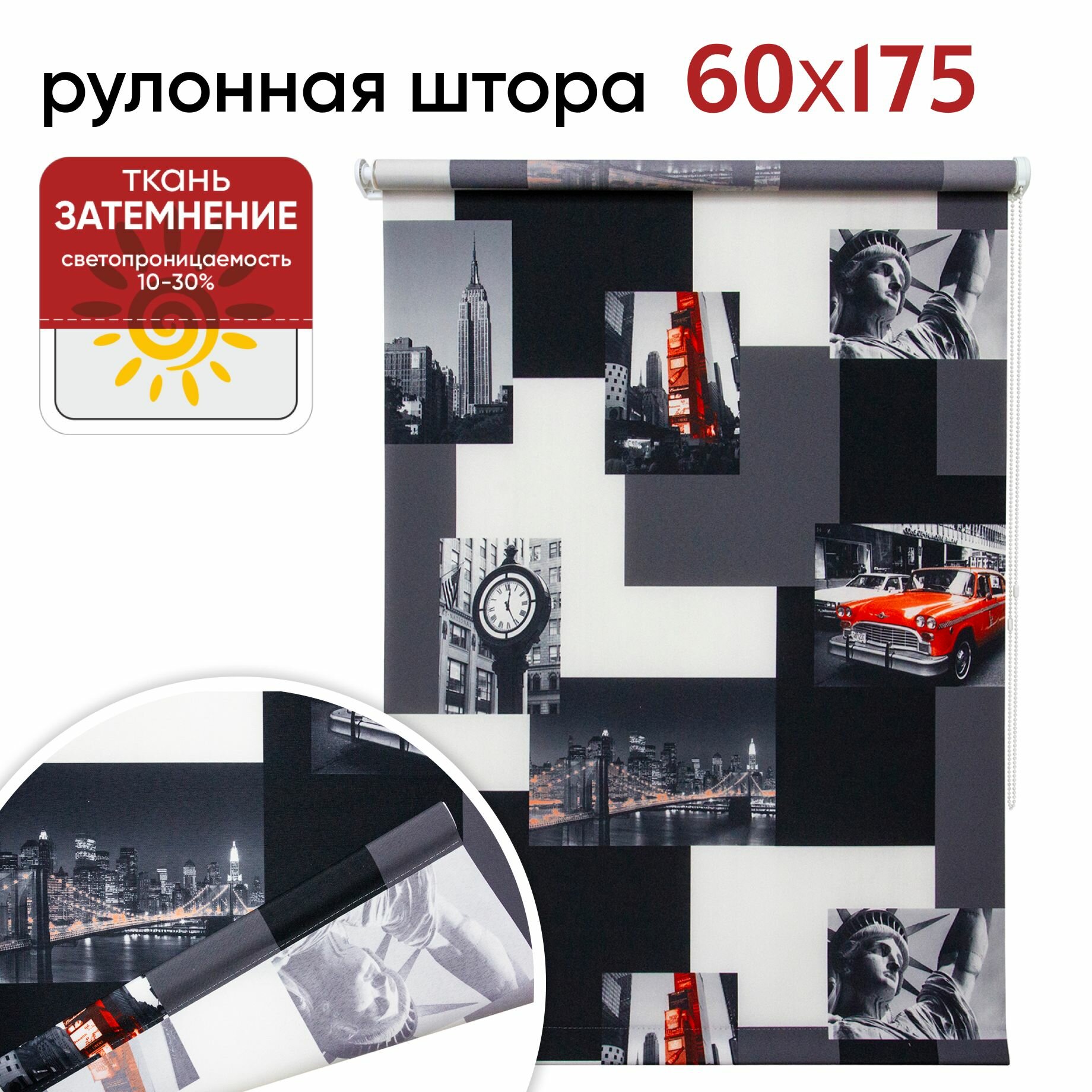 Рулонная штора УЮТ 60 см высота 175 см, Нью-Йорк красно-серый, рольштора полиэстер, затемнение 70%