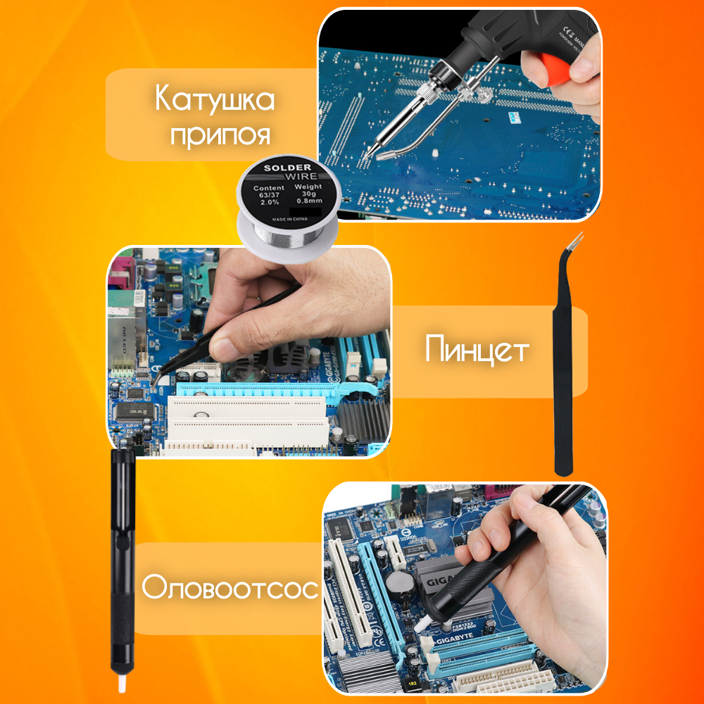 | Комплектация | Паяльник, катушка припоя, оловоотсос, подставка, пинцет |