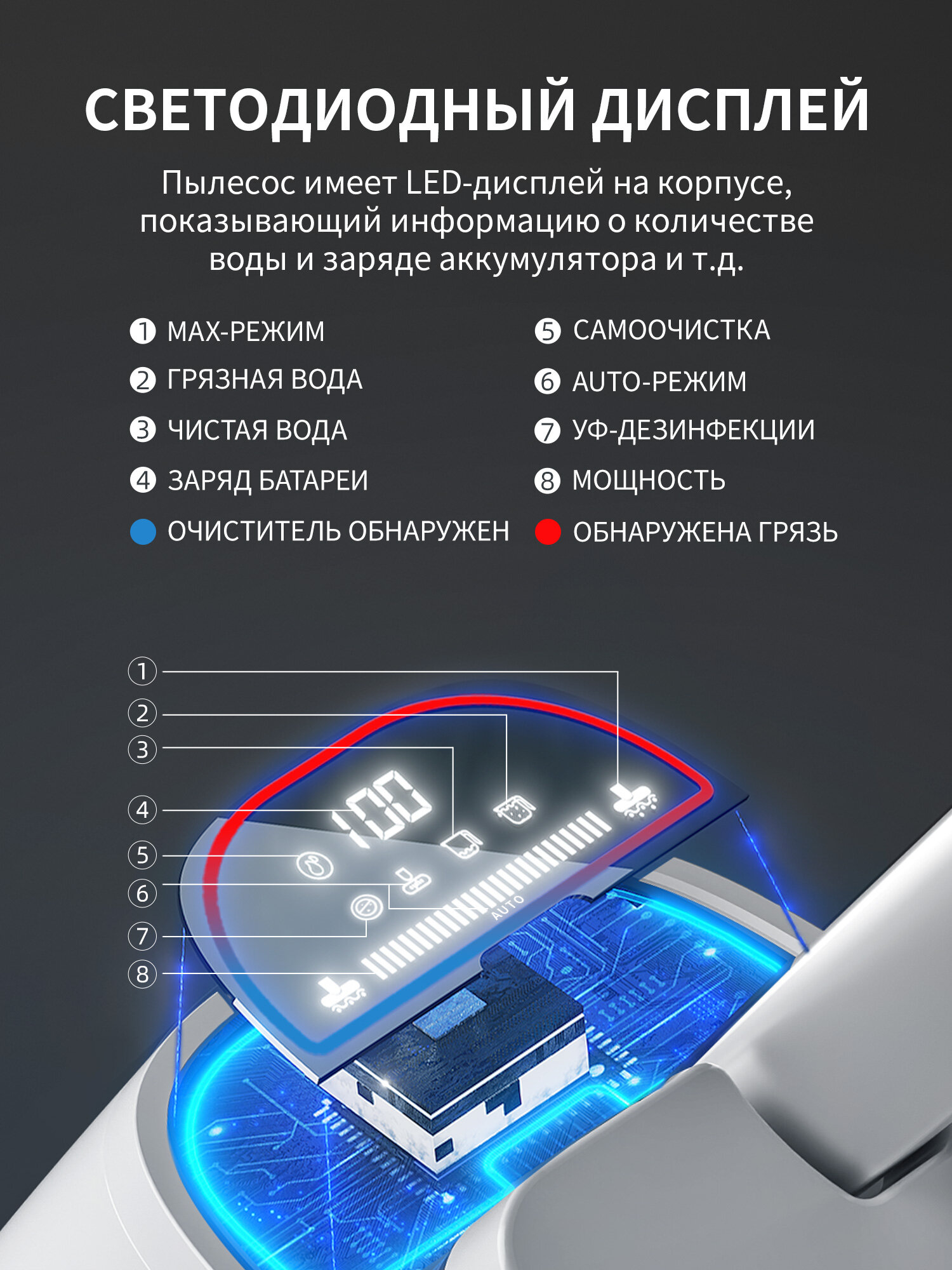 | Особенности конструкции | вертикальная парковка / датчик распознавания загрязненности / индикатор заполнения пылесборника / управление мощностью на рукоятке / функция самоочистки |
