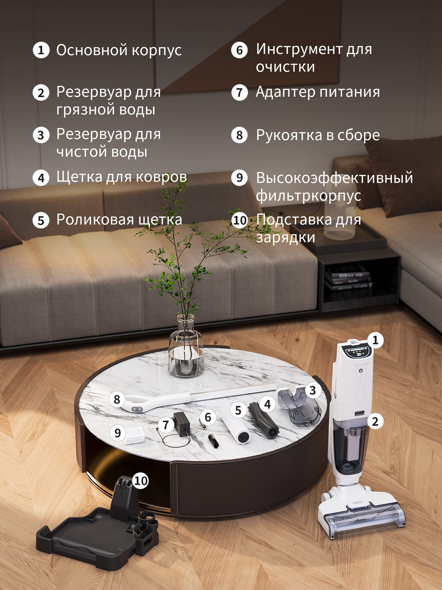 | В комплекте | зарядное устройство, насадка для ламината и паркета, насадка для сбора жидкости, подставка для хранения, турбощетка, фильтр тонкой очистки |