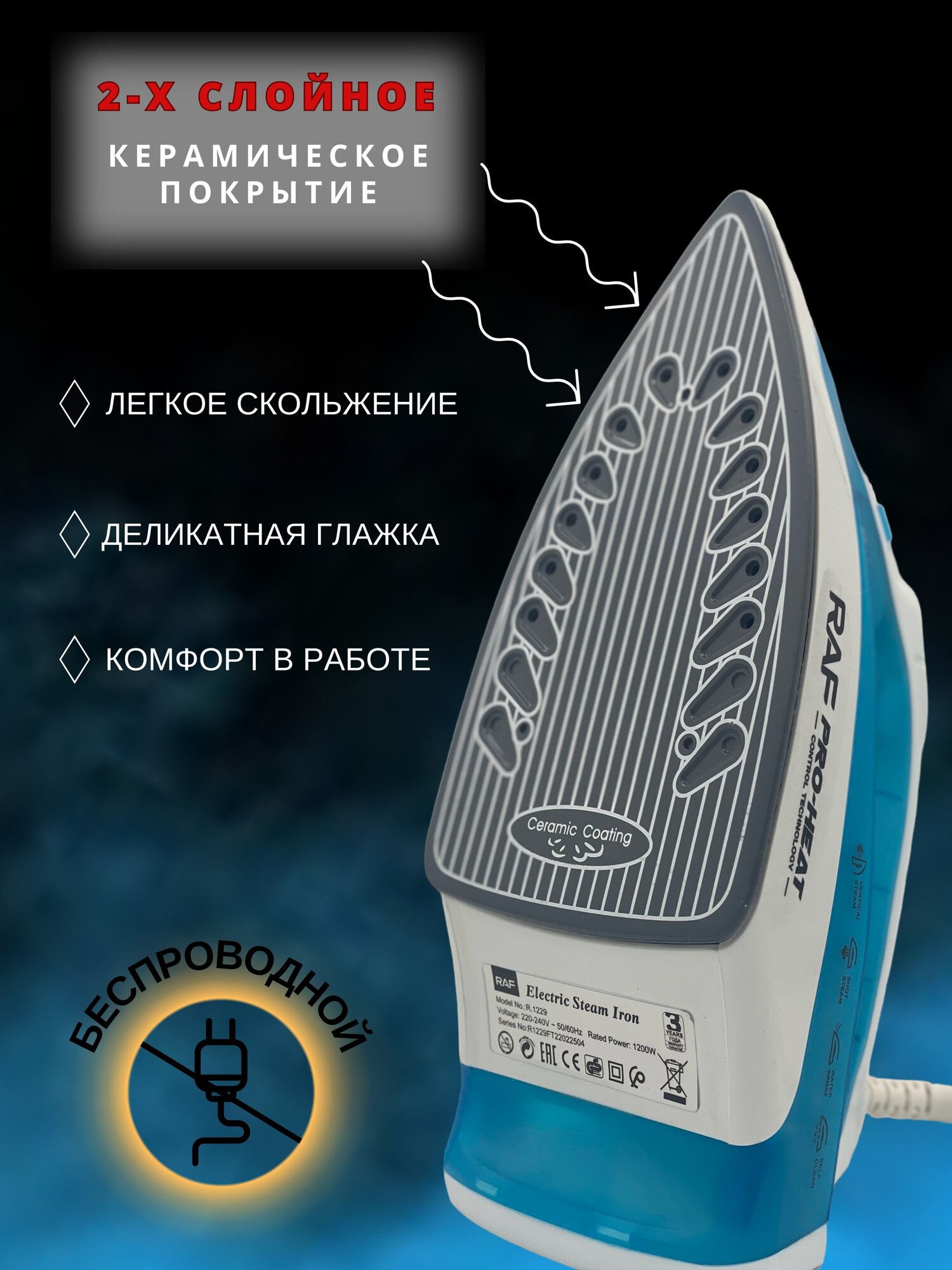 | Дополнительная информация | Утюг паровой RAF R1229B самоочищающийся 1200вт белый синий голубой керамическое покрытие |