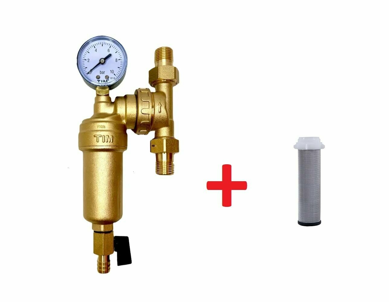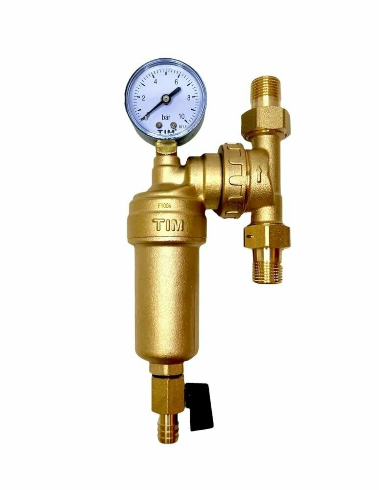 Фильтр самопромывной свободного вращения 1/2" НН с манометром американками и сливным краном, металлический корпус TIM арт. JH-1001W3 + сетка интересное: